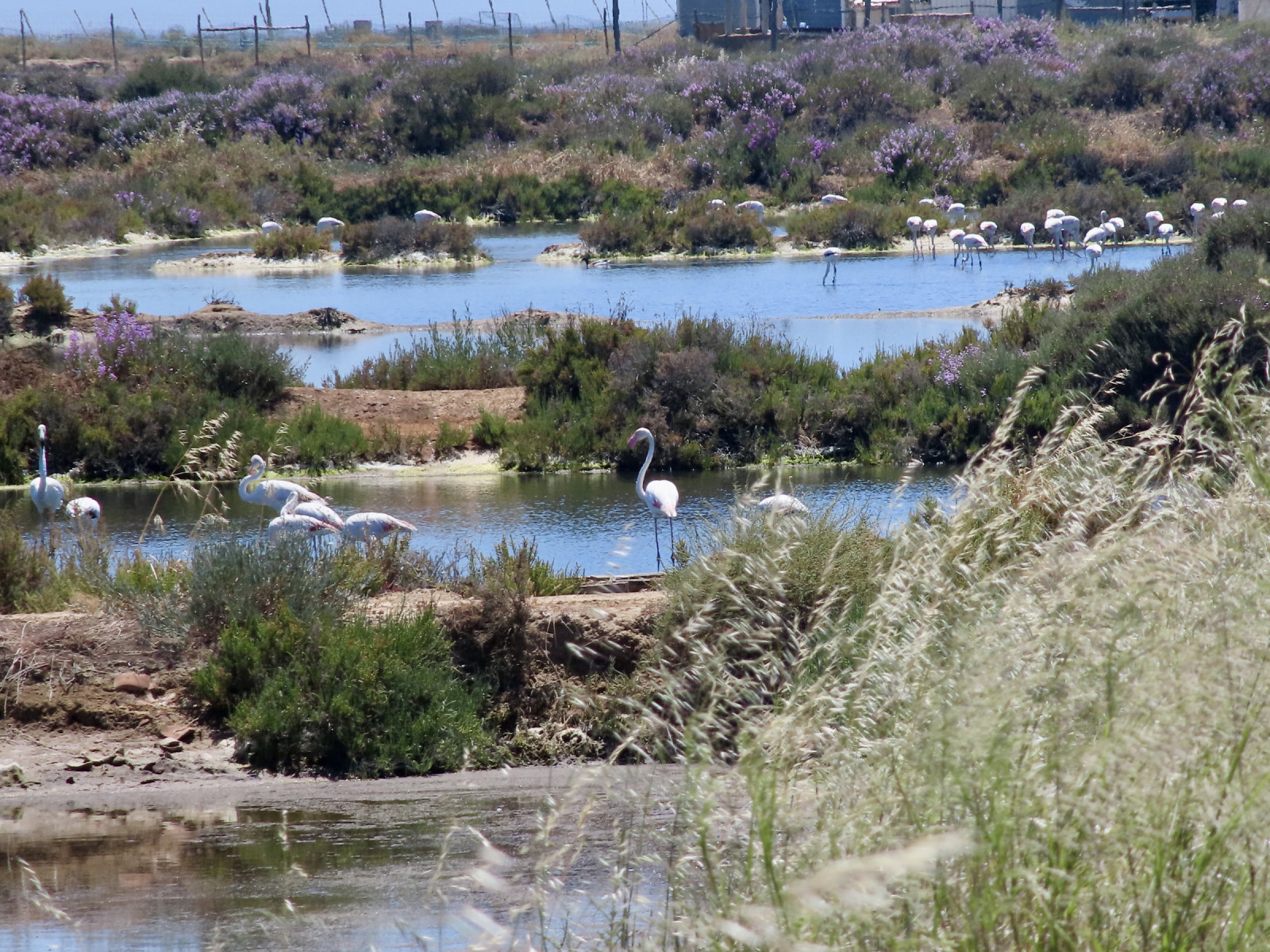 The saltpans are situated in the saltmarshes. Once you've parked you can easily enter the area walking or cycling and explore every saltpan that is accessible (some are blocked or there is no way to access without getting kneedeep in the mud). In the northern ones you will find ducks such as the Common Shelduck, Mallard and Gadwall, whereas closer to the lagoon (sea side) you'll find more waders such as the Dunlin, Sanderling, Curlew Sandpiper, Kentish Plover, Common Ringed Plover, Whimbrel and Black-winged Stilt. A bit further way from the access, to the east, it is very common to find groups of Greater Flamingo that allow bystanders to get quite close.