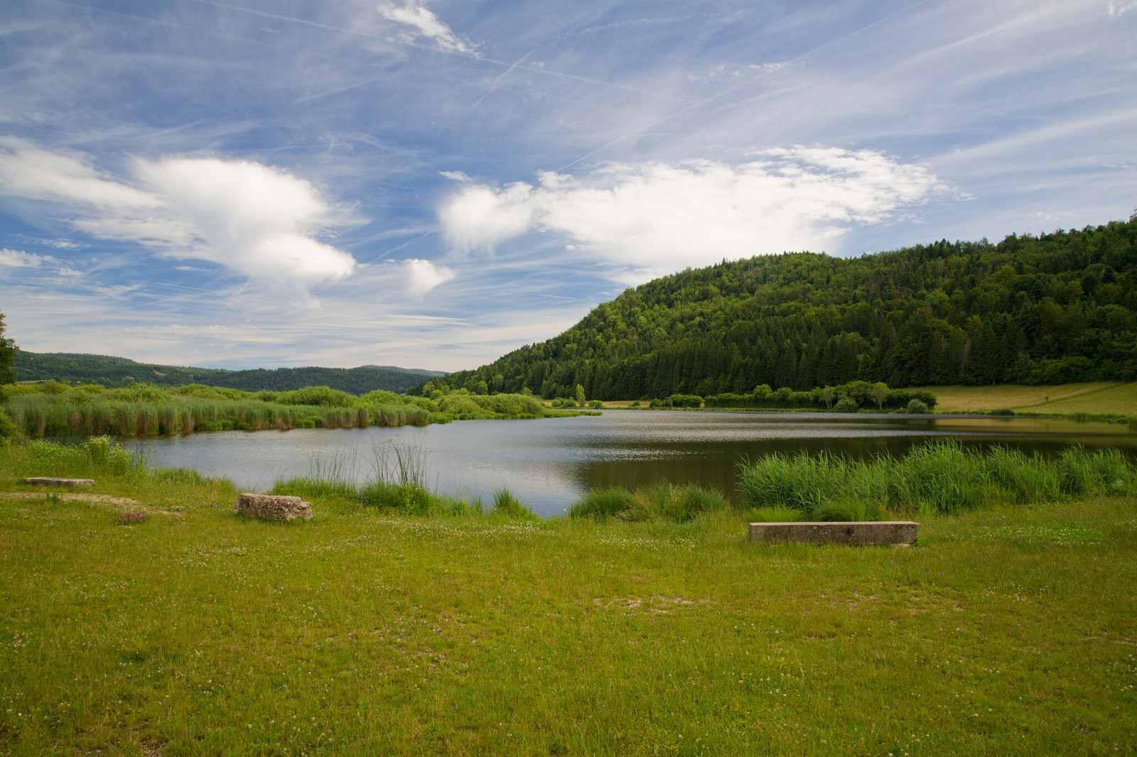 Marais de Vaux is located southwest of Hauteville-Lompnes. There is a car park on the Route des Lésines, next to the hamlet of Les Lésines. Press P on the map for directions. From the car park you can start a 5 km walking loop. The route consists of grassy paths with bushes, wooden boardwalks in the marsh section, and a path through the undergrowth of the forest on the west side of the lake.
