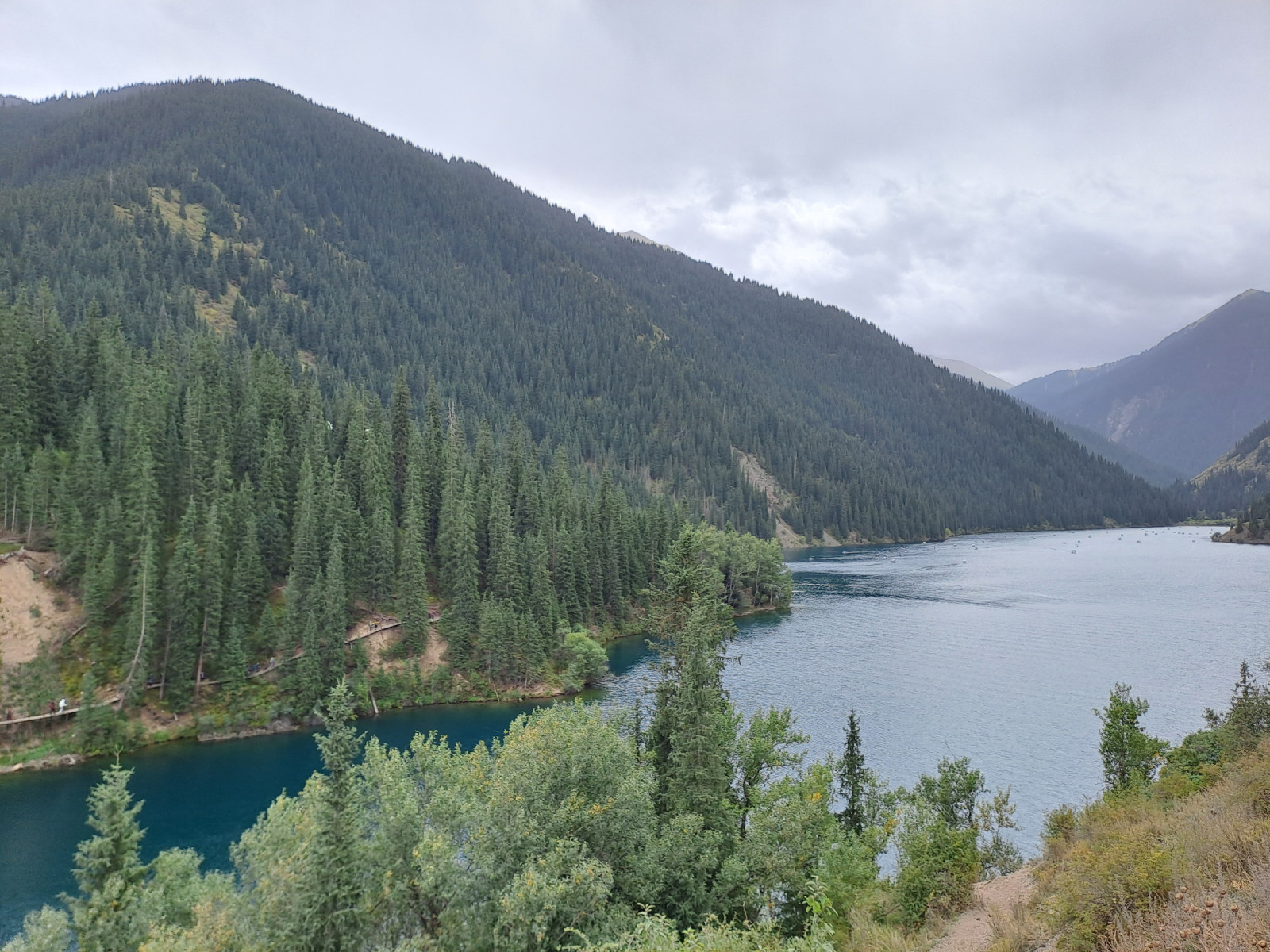 The Kolsay Lakes consist of three mountain lakes surrounded by forest, located on the northern side of the Tian Shan Mountains.