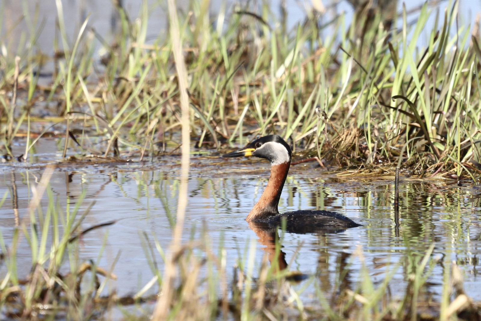 Nederlands: Het bijzondere van de vogelkijkhut in Diependal is dus de toegang via een ondergrondse gang. Zo kom je midden in het gebied zonder iets te verstoren. Vanuit de hut heb je een prachtig uitzicht over de vloeivelden. In de zomer broedt hier de Red-necked Grebe, maar je kunt hier ook Black-necked Grebe verwachten.