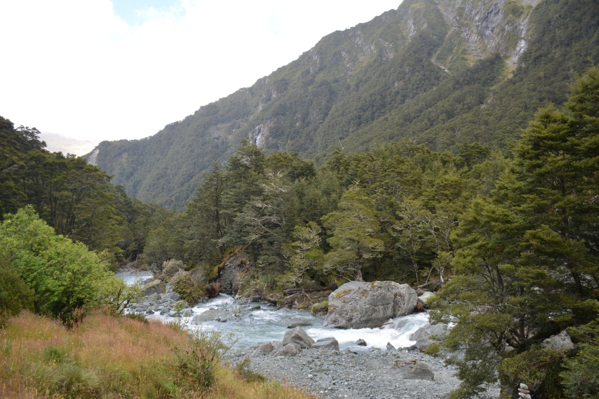 The Rob Roy Track begins at the Raspberry Creek car park, 54 km west of Wānaka on the Wānaka–Mount Aspiring Road. The last 30 km are unsealed, and the final 10 km may become unsuitable in bad weather due to creeks flooding, in particular for low-clearance cars. The drive takes about an hour. There’s a toilet at the car park and another along the track below lower and upper lookout.