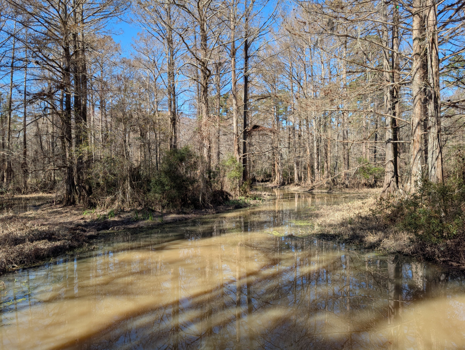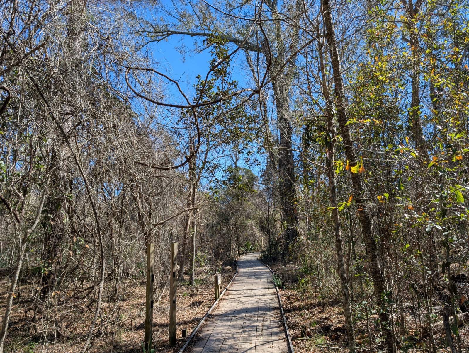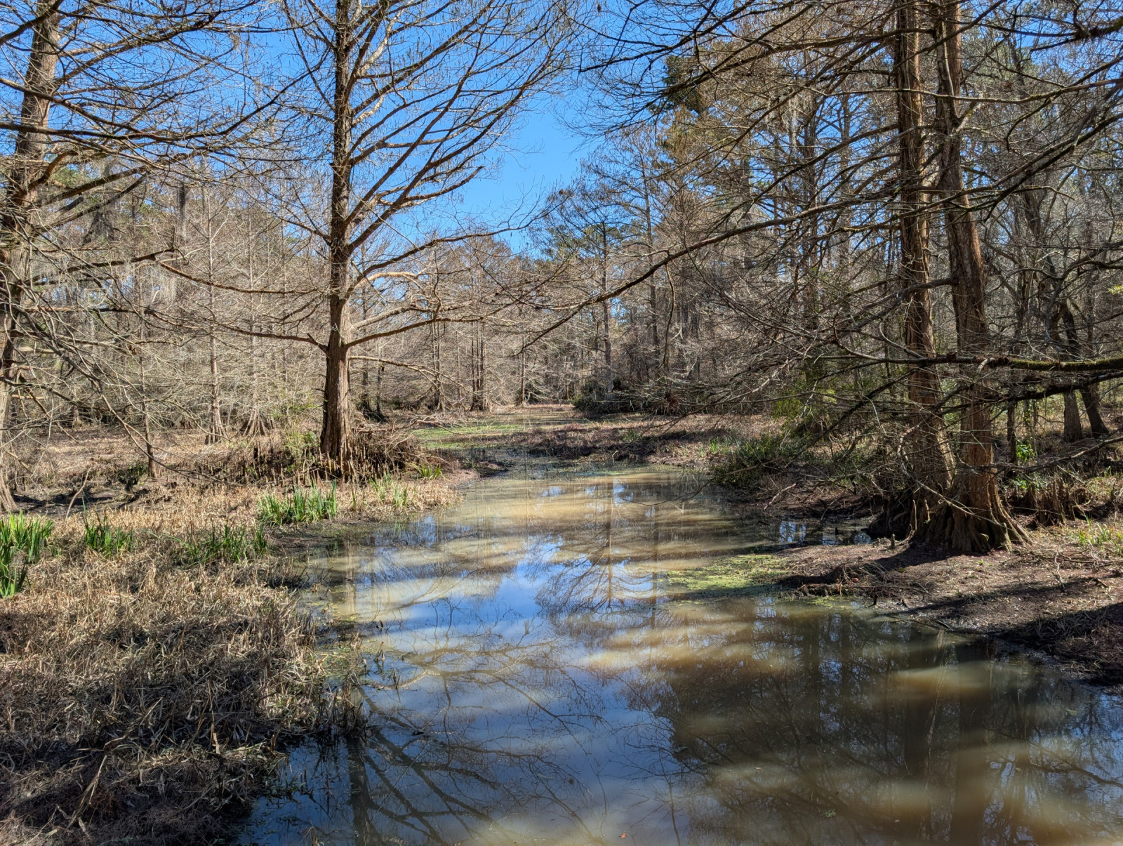 Entering from the north end adds mixed pine-hardwood forests leading parallel to the bayou. There is a long-leaf pine savannah restoration project here as well. There is a weedy pipeline right of way next to the northern entrances that should be checked for species like Red-shouldered Hawk.