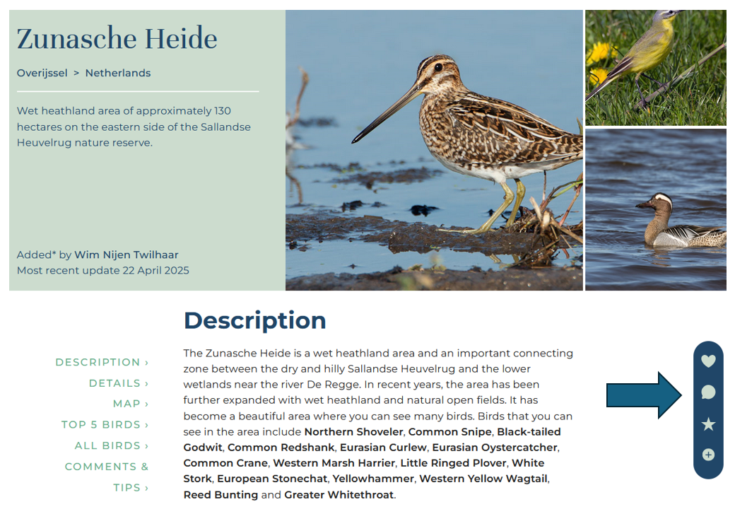 Obecnie, obok każdego opisanego miejsca obserwacji znajdziesz niewielkie menu (niebieska strzałka powyżej) gdy korzystasz z komputera lub tabletu, w prawej części ekranu,a w przypadku smartfona w dolnej części ekranu. Po kliknięciu w ikonę (dymek) pojawi się okienko z 3 polami. W górnym polu możesz przekazać opinię na temat tekstu. W drugim możesz przekazać opinię na temat zamieszczonej mapy. W trzecim polu możesz umieścić opinię na temat listy ptaków przypisanej do tego miejsca.