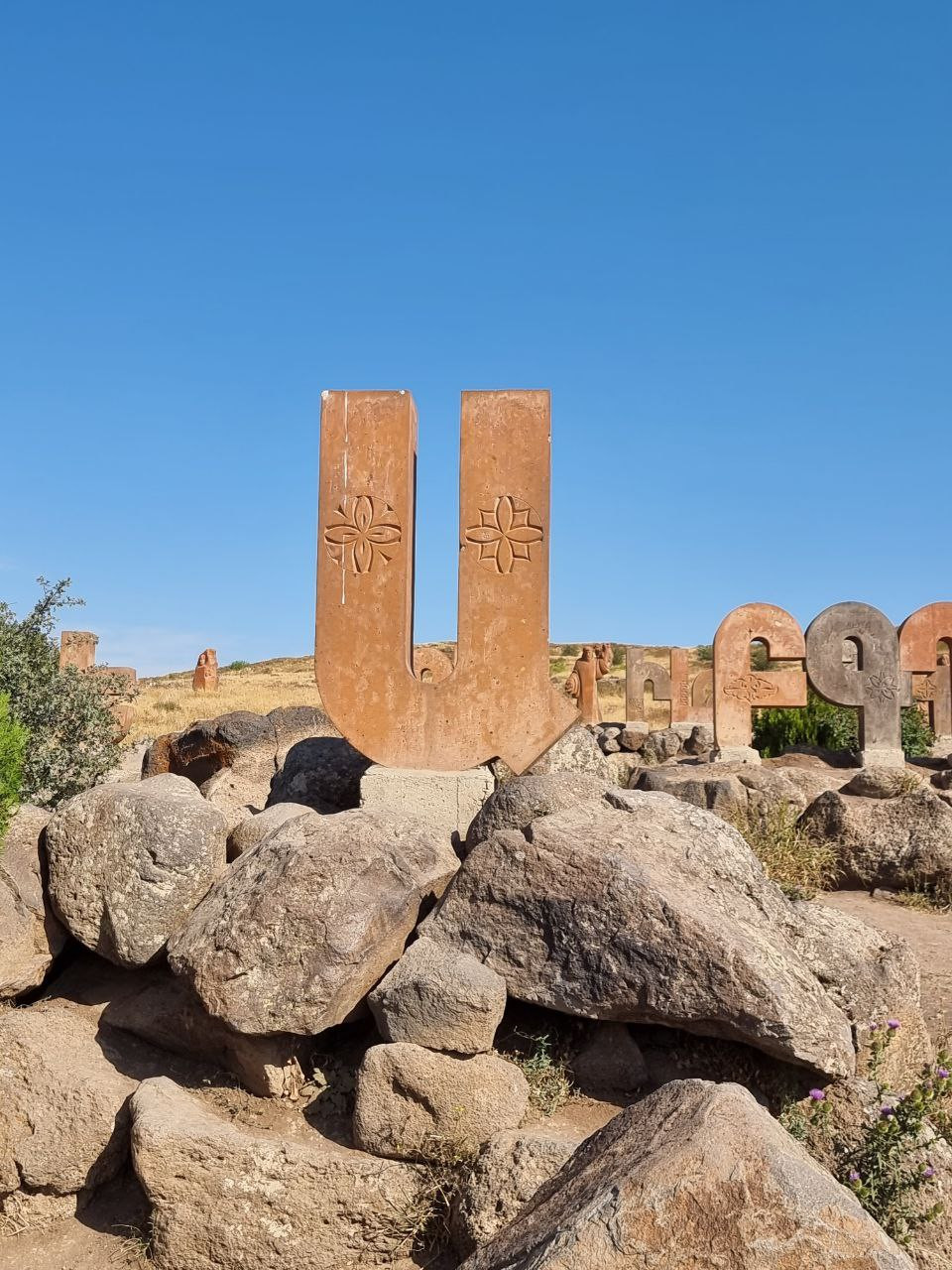 The Armenian Alphabet Monument is located in Aragatsotn Province, about 40 km northwest of Yerevan, along the road to Mt. Aragats. You can reach it by car via the M1 highway. There’s a small parking area right next to the monument. Press P on the map for directions to the parking. Public transport options are limited, so driving or taking a taxi is recommended. The site is compact and best explored on foot. Allow about 1–2 hours for a relaxed visit with time to birdwatch and enjoy the scenery. The surrounding fields and slopes can also be explored by footpaths for those wanting a longer walk.