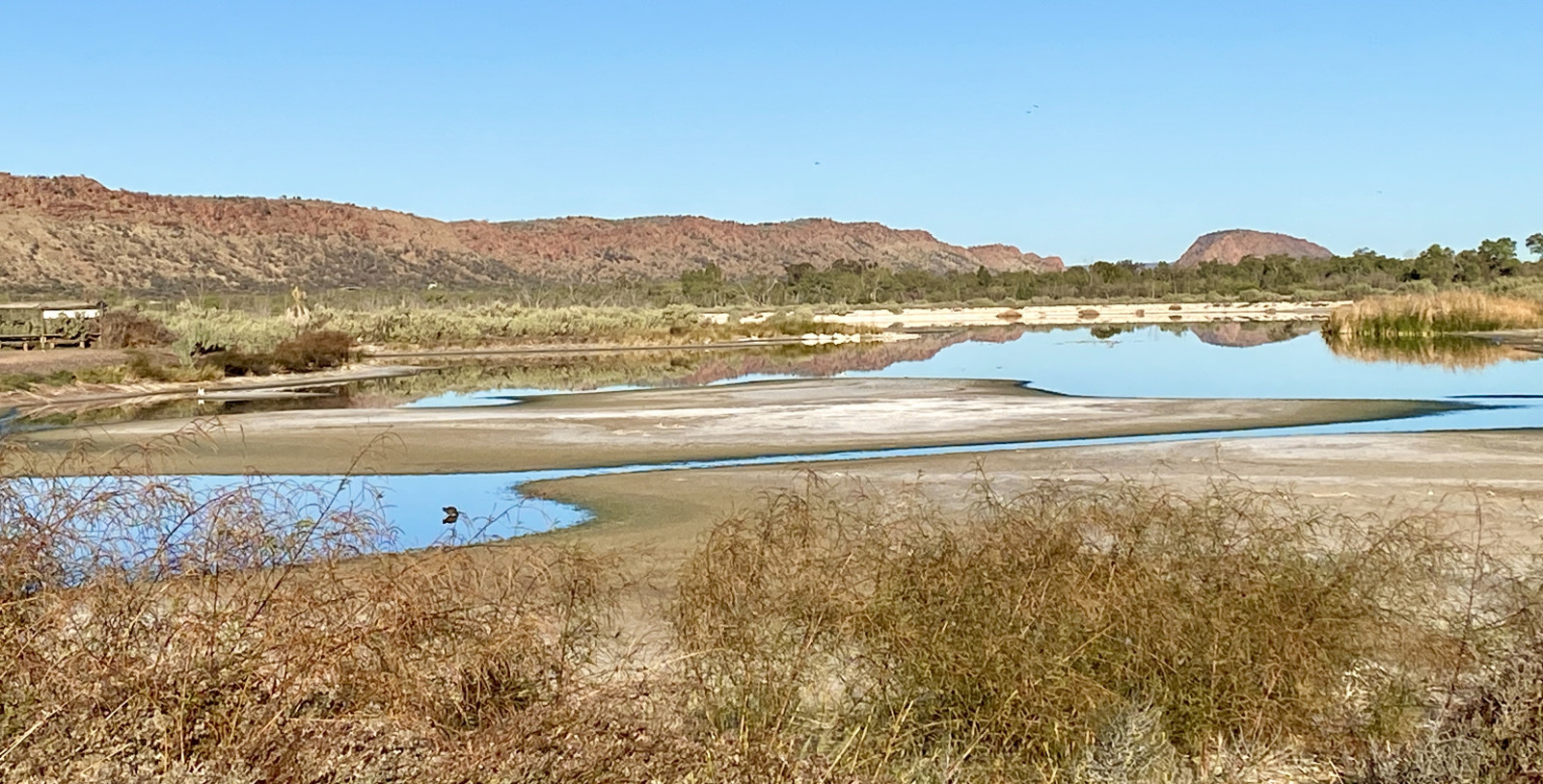 Alice Springs Sewage Ponds is a fenced area of water treatment ponds holding waterfowl and migratory birds surrounded by saltbush and other vegetation - eucalyptus, etc. All surrounded by rocky escarpment. The bird life at the waste stabilisation ponds is spectacular, with many rare species gathering around this body of water. Purpose built bird nesting islands, as well as a bird screen and interpretive signs have also been constructed at this site.
