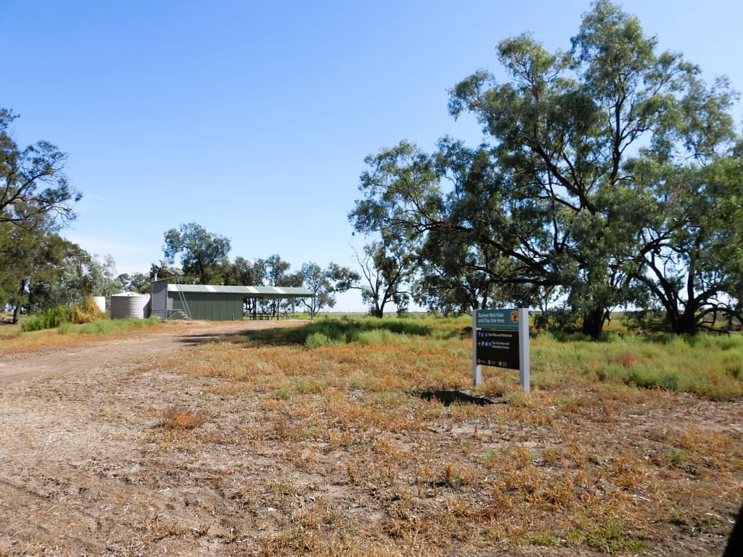 Gwydir Wetlands - Waterbird Lagoon is 60 km west of Moree along Watercourse Rd. Dirt road part way. Gates open 5 am to 8 pm. Amenities include a covered picnic area and a toilet. Click on the P in the map for directions or coordinates of the parking. From the parking at the picnic area it is a short walk to the bird hide. Not wheelchair accessible. It is possible to explore further into the wetlands by kayak/canoe. The location is not accessible during wet weather. Check with National Parks NSW or local Tourist Information.