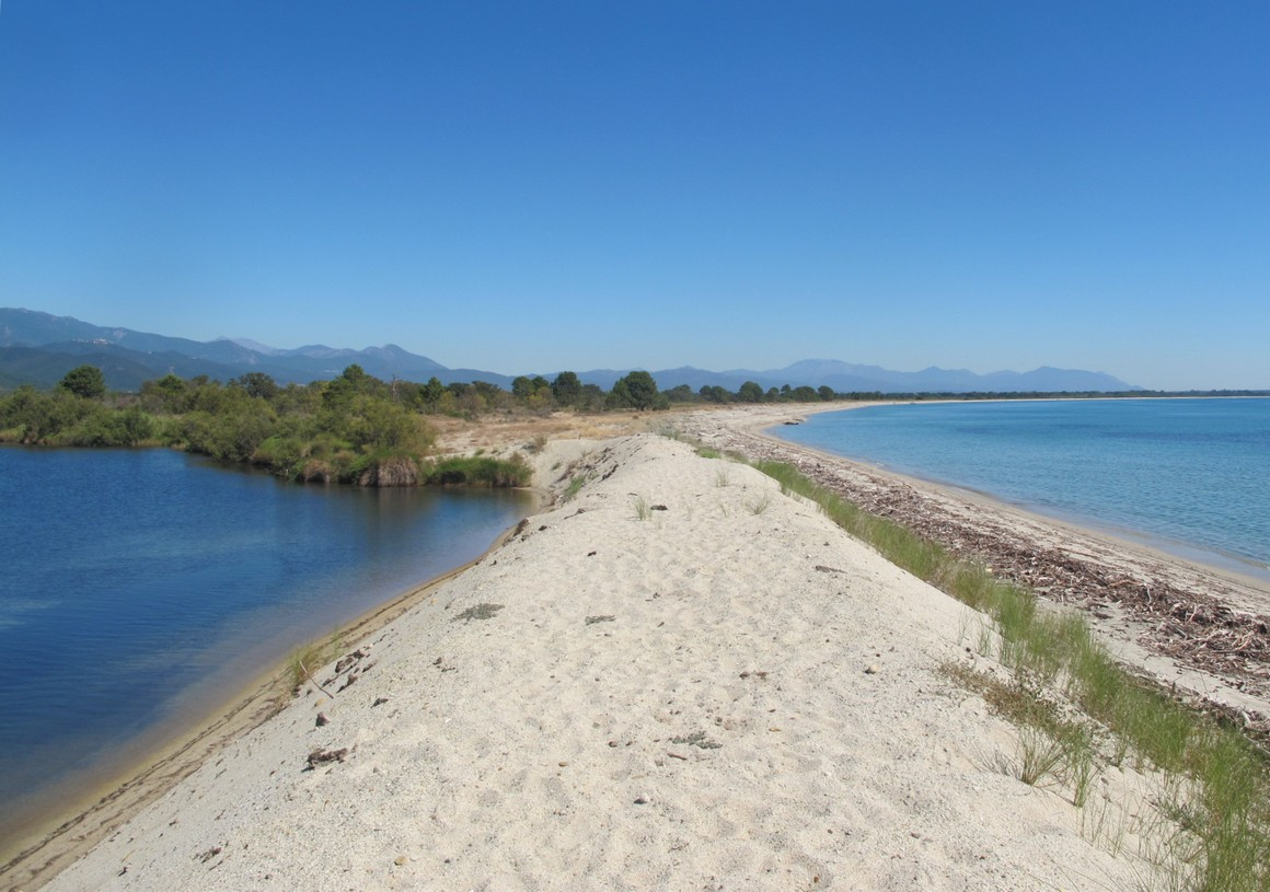 The Étang de Palo is located on the east coast of Corsica 100 km south of Bastia, between the T10 coastal highway and the Mediterranean sea. It is south of the village of Mignataja and just north of the Solenzara Air Base. You can take a walk of about 5 km there and back over the sand bar. Press P on the map for directions to a parking spot.