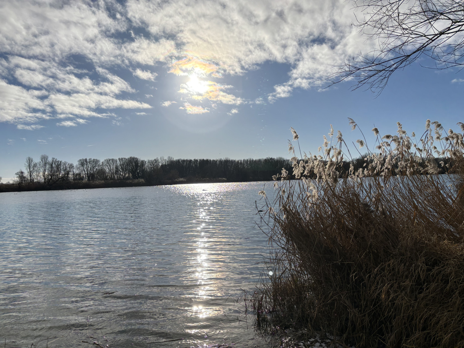 The Danube oxbow near Tegernheim is a quiet floodplain landscape with still backwaters, shallow channels, reedbeds, wet meadows, shrubs, and riparian woodland, creating a rich mosaic of habitats.