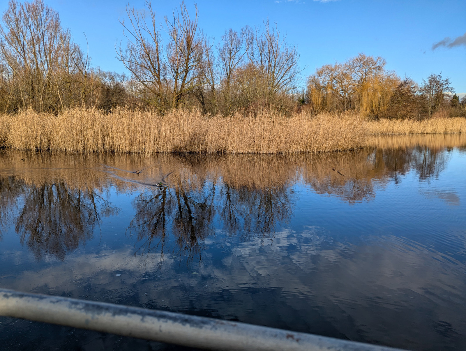 In the middle of Ziegeleipark lies a lake with varied shores: grassy shores alternate with gravel and sandy beach as well as with heavily overgrown banks with marsh and water plants on the small peninsula and in the transition to the wetland. Striking eye-catchers are the up to 15-metre-high steep walls made of loess clay at the water tower. They are home to rare wild bee species and are protected. There used to be kingfishers at the lake before they were disturbed by visitors who approached the birds too close from the land side. Birds you can observe in the area include ďateľ veľký, žlna zelená, kačica divá, červienka obyčajná, sojka obyčajná, sliepočka vodná and labuť veľká.
