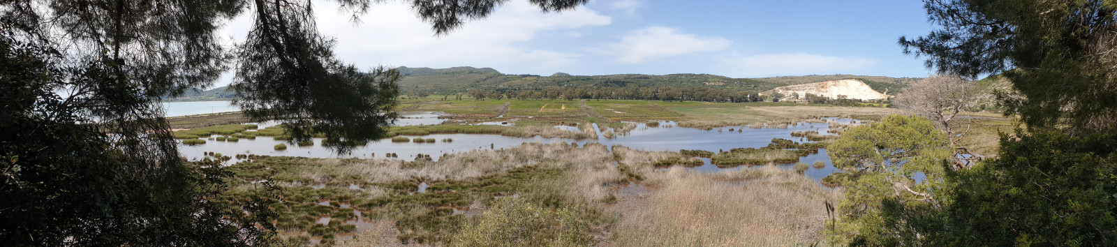 Drive down to Lixouri on the mountain road from Argostoli, just as you reach sea-level there are two parking spots. The first alongside a concrete wall on a hairpin bend and a little further down, practically at the sea road. The best place to observe the marsh is from a path which runs from just by the concrete wall along a hillside, past fly-tipped household & building junk to a grove of fir trees overlooking the marsh.