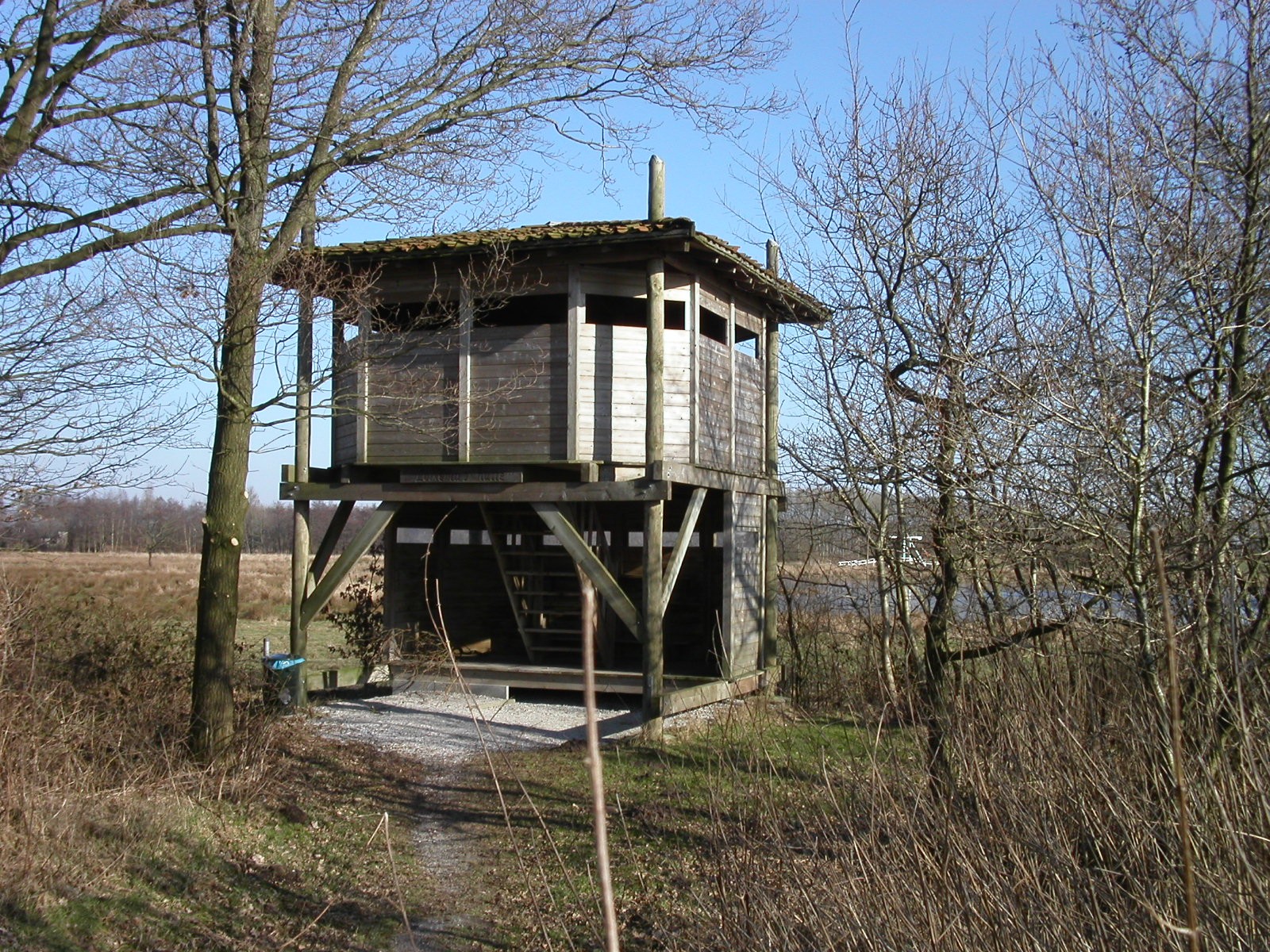Nederlands: Vanaf de parallelweg van de provinciale weg is de parkeerplaats bij het begin van het fietspad. Klik op de P in de kaart voor een routebeschrijving. Vanaf de parkeerplaats is het 800 meter naar de kijkhut.