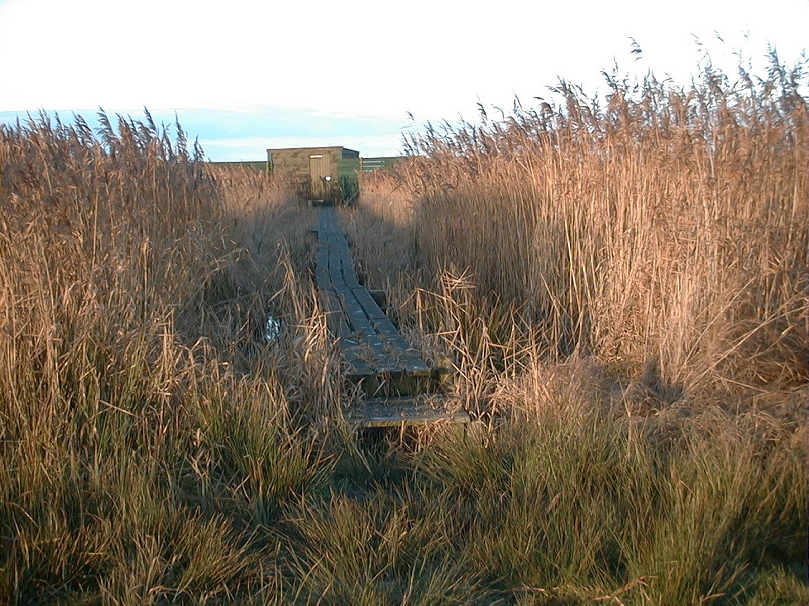 Small lake surrounded by reed beds and marsh. Good for seeing big groups of birds.