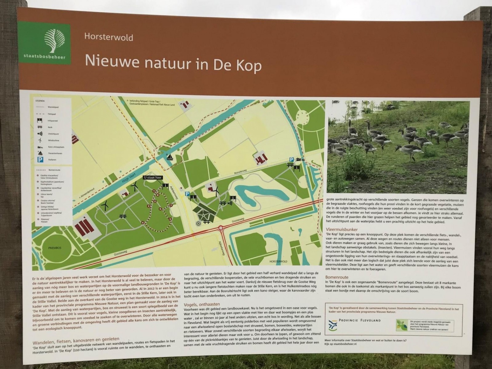 Nederlands: De Kop van het Horsterwold is een nieuw aangelegd natuurgebied dat de potentie heeft om uit te groeien tot een mooi gebied met veel soorten vogels. Het gebied van 110 hectare met bos en water grenst aan het Horsterwold, een groot aaneengesloten loofbosgebied.