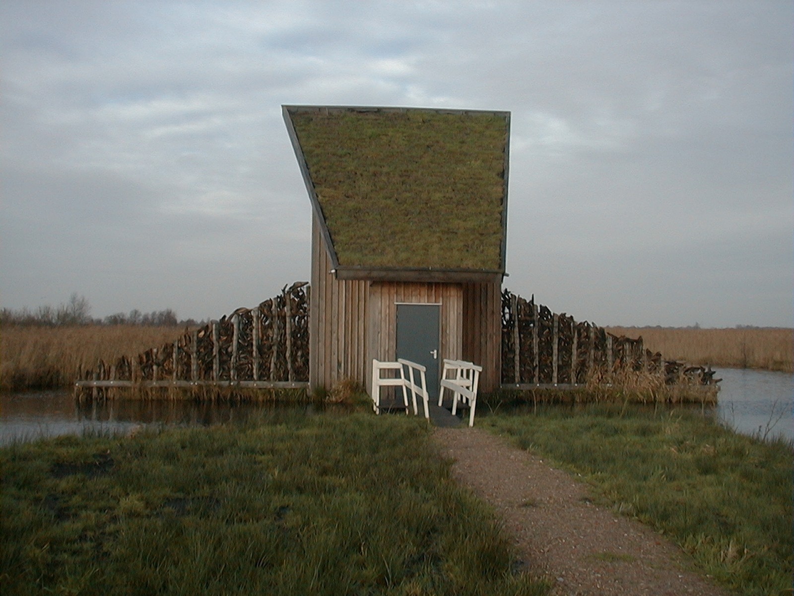 Nederlands: Vanaf de Lindedijk loopt een route van 900 meter naar de opvallende vogelkijkhut.