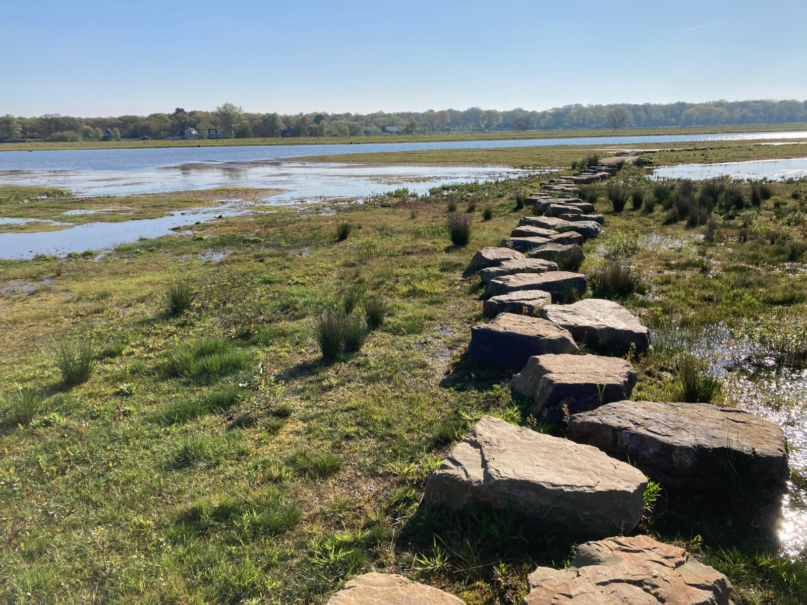 Nederlands: De ruime parkeerplaats naast Recreatiepark Kasteel Ooijen is een goed beginpunt van de wandeling. Klik op de P in de kaart voor een routebeschrijving. De wandeling die is weergegeven op de kaart is ongeveer 3 km. Er is een verhard pad, maar je mag ook vrij door het gebied struinen. Er zijn enkele plekken met stapstenen, waardoor je die natte plekken ook bij hogere waterstand kunt bereiken.