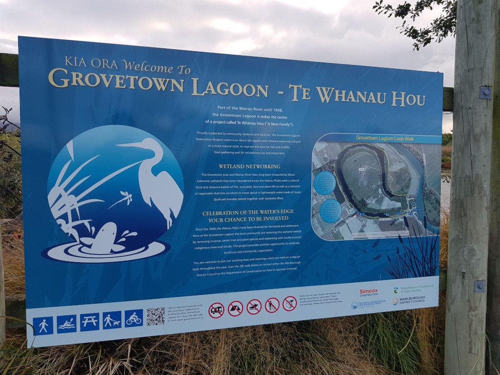 The Grovetown Lagoon lies about 1 km East of State Highway 1 and about 5 km North of Bleinheim. In Grovetown, turn from the 1 into Fell Streeet and follow it to the end, there continuing on Steam Whar Road to the carpark. Click on the P in the map for directions or coordinates.