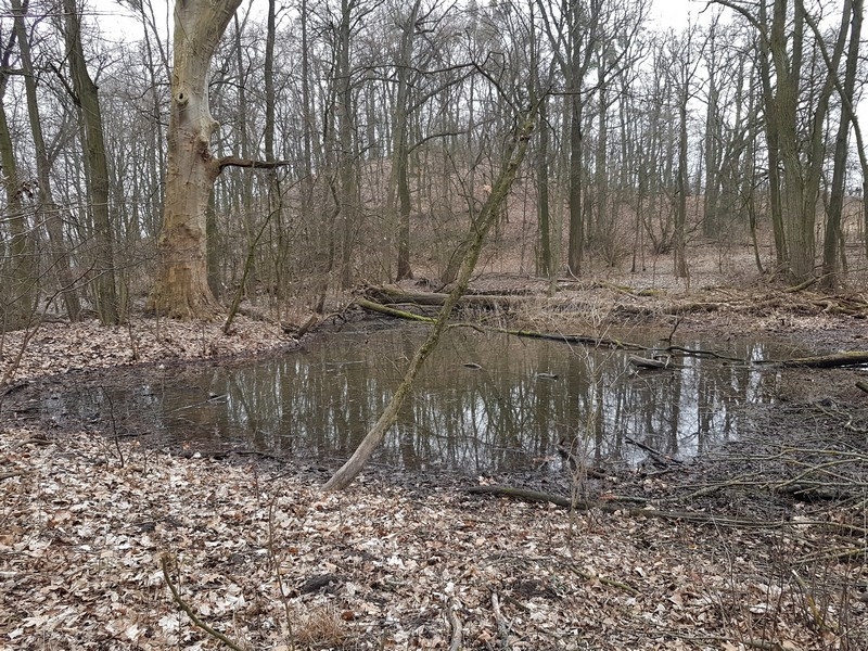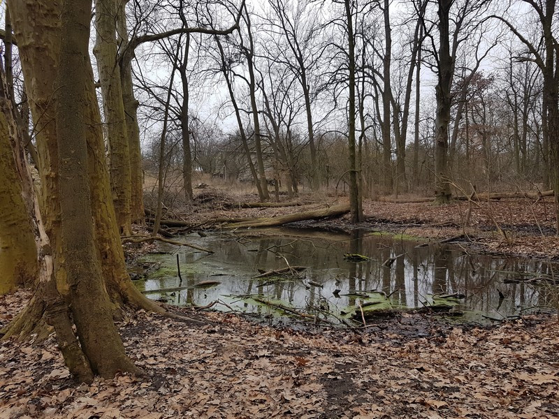 Deciduous nature-like forest with considerable geomorphological diversity, 3 mid-forest ponds, geophytes blooming in spring, and a large amount of dead wood.