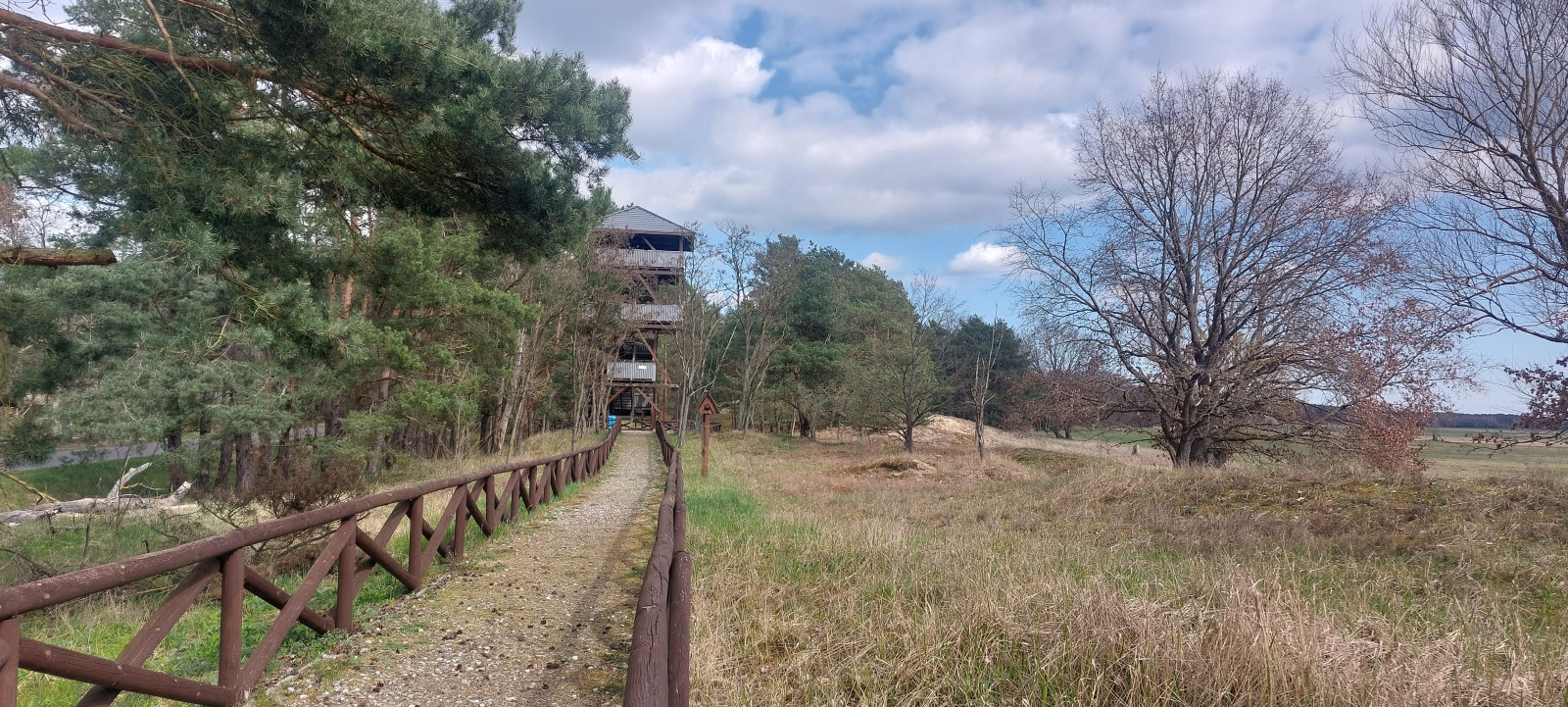 The observation tower is located about 400 meters from the river bank. The view from the tower overlooks the riverside meadows, which can be flooded in winter and spring, creating vast, shallow pools. From the car park next to the tower, a short educational path leads along the edge of the forest among hilly mid-forest dunes, meadows and reed beds.