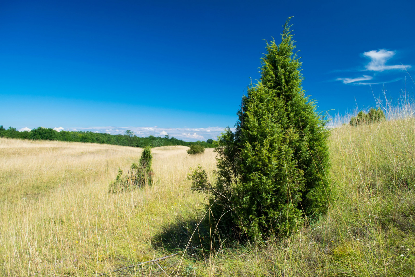 Grassland with beautiful needle grasses (Stipa) on rolling sand dunes, interspersed with bushes of hawthorn and junipers.