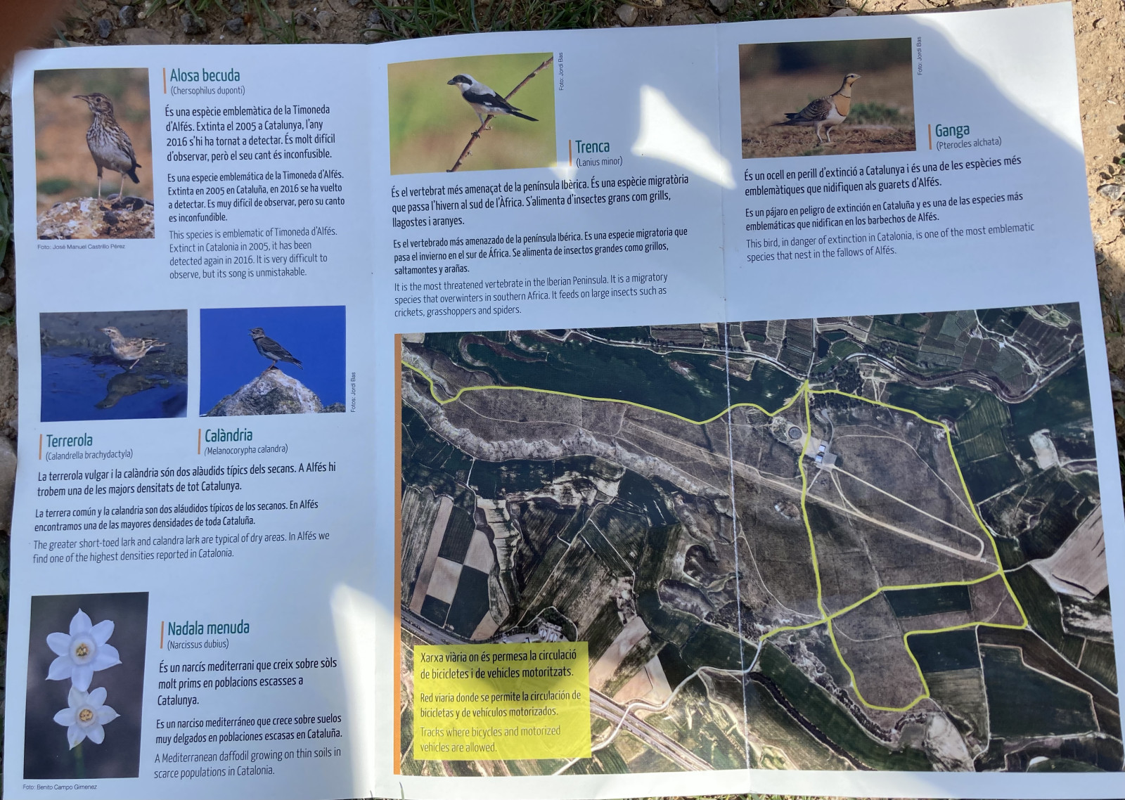 Espagnol: Timoneda d'Alfés es una area donde està lleno de tomillo y con elllo también muchos pájaros. Este sitio es el mejor sitio de Cataluña para ver el Críalo Europeo, por lo tanto mucha gente viene a verlos.