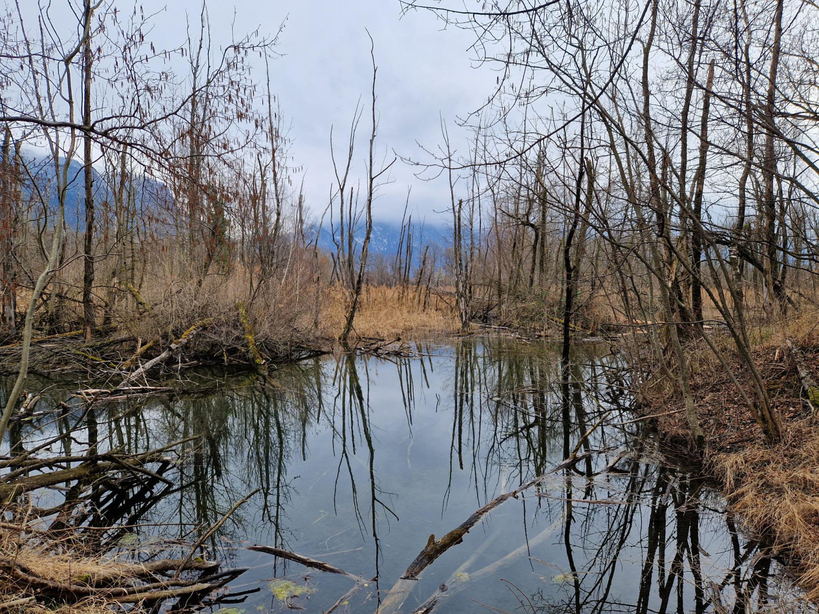 The valley of the Rhine, which originates in Grisons / Graubünden, has been entirely cultivated and is intensively used in this canton; wetlands and alluvial forests are almost completely absent. The 7-hectare area of "Siechenstuden" (also known as "Siechastuden", "Siechastuda") is a rare exception. Two mountain streams cascade down the slopes here; a high, artifical embankment protects the area from their destructive force, but it is still supplied with water. Inside the embankment, there is a peaceful riverbed, gravel banks, several artificial ponds, reed beds, shrubs, abundant deadwood, and an area resembling an alluvial forest which turns into a deciduous and then coniferous forest further from the marsh. This location is particularly interesting for toads, frogs, and newts, but also attracts water-associated birds—most notably those stopping here for rest after their strenuous Alpine crossing in spring.