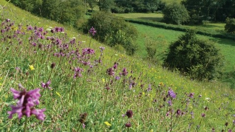 A steep valley with mixed habitats on either side, a mosaic of decidious woodland and limestone meadows.