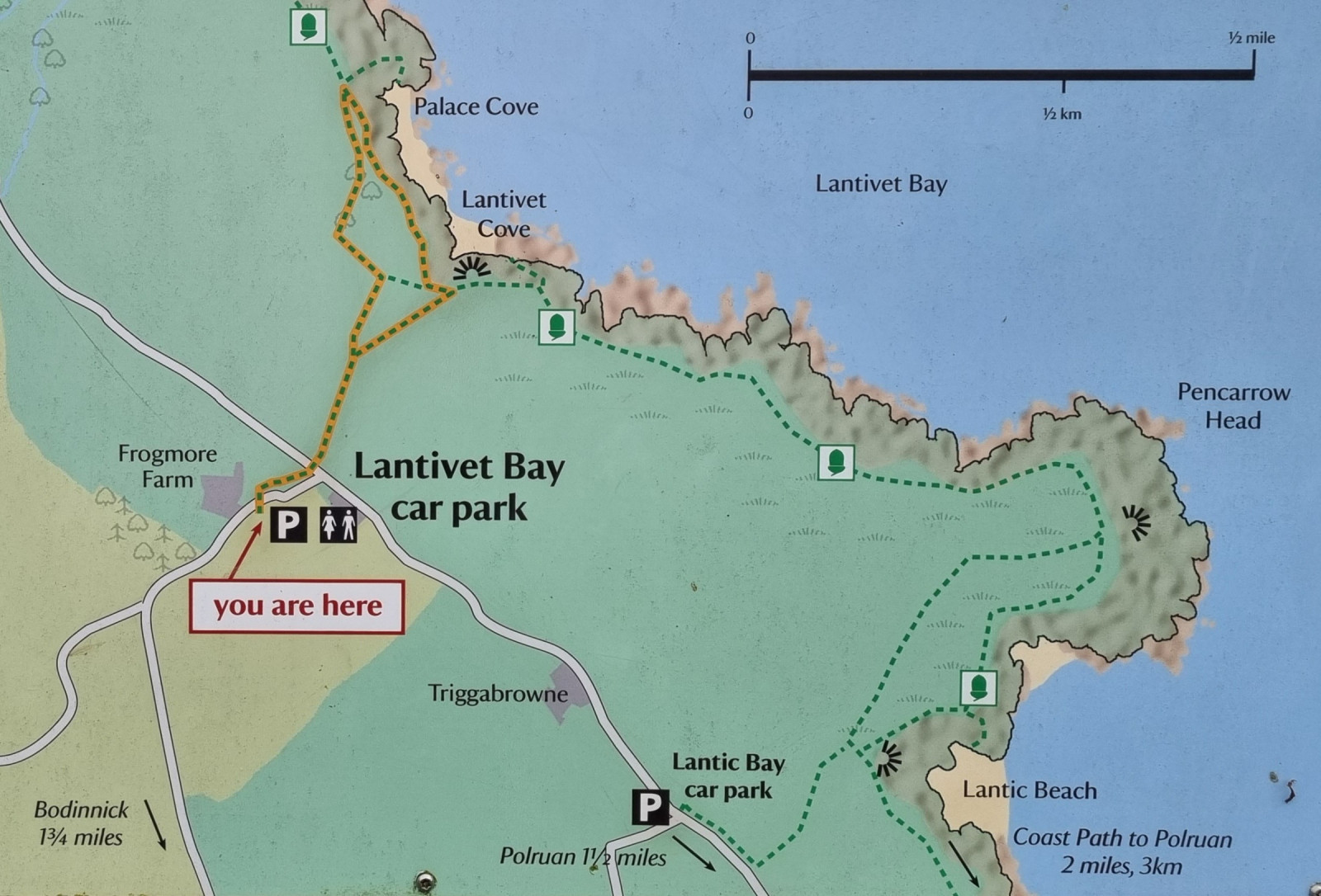 Lantic Bay can also be accessed on foot from Polruan. The circular route indicated on the map is about 4 km. The route has a section of country lane walking where care needs to be taken. Coast paths are best walked in dry weather. The path can be slippery after rain.