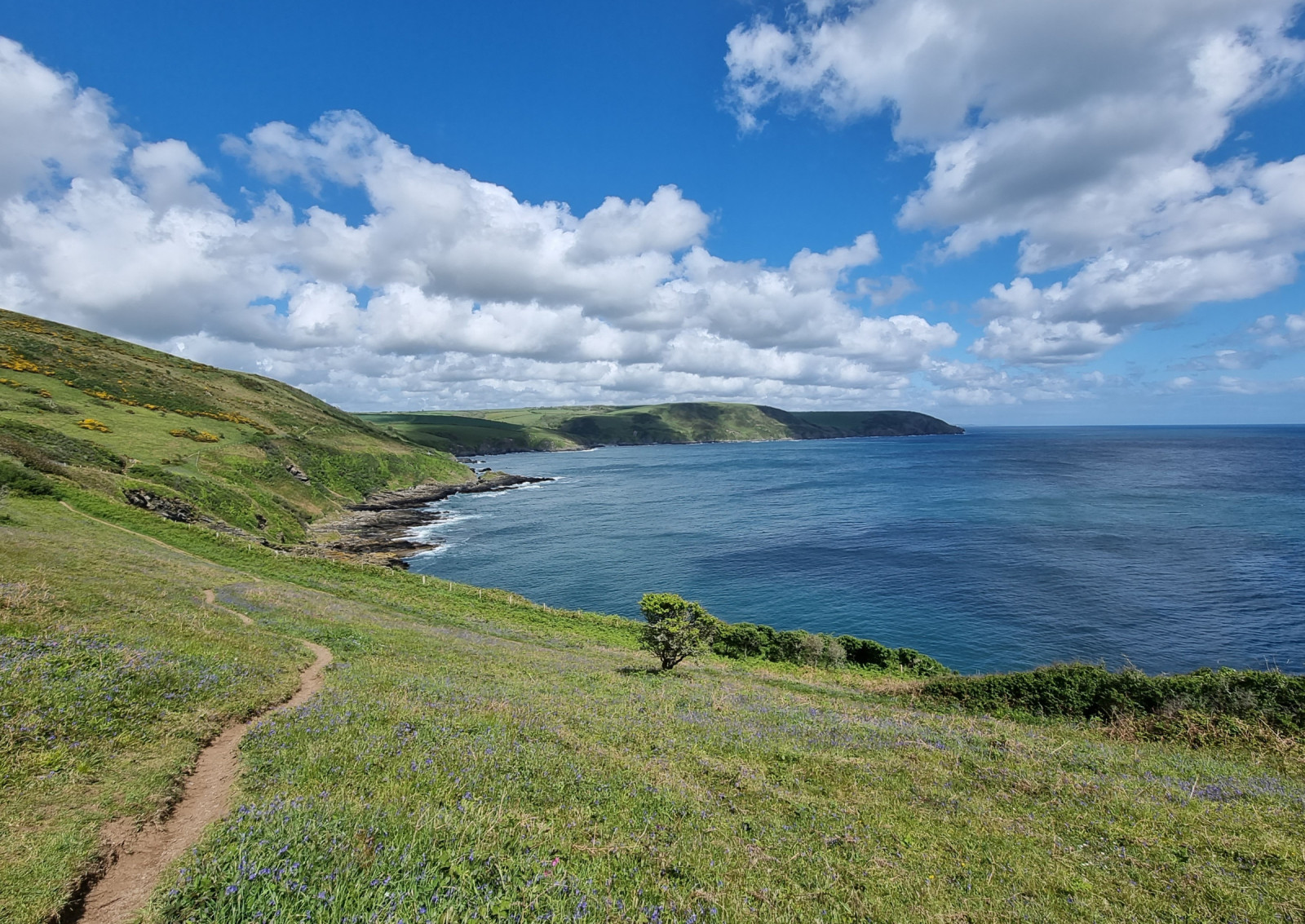 The walk includes views of Lantic Bay (to the west) and Lantivet Bay (to the east). There is a path down to the beach at Lantic Bay, but it is a steep climb back up to the circular route.