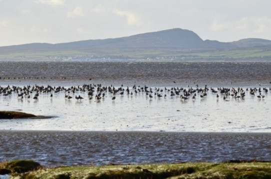 5,000 bernikľa bielolíca roost at Bridgend Flats at the landward end. A convenient road, with several specially provided bird-watching lay-by, hugs the shore from Bowmore to Bruichladdich, enabling one to view both the tidal sandflats at the head of the loch, where hvizdák veľký, lastúrničiar strakatý, brehár hrdzavý and pobrežník čiernozobý occur in hundreds, and kulík piesočný, kalužiak červenonohý, pobrežník hrdzavý, kulík bledý and others in at least tens. And also the shallow water, on which a flock of up to 300 chochlačka morská, up to 50 potápka ušatá, large flocks of kajka morská, perhaps 25 hlaholka severská, a dozen ľadovka dĺhochvostá, plenty of labuť spevavá and labuť veľká and several hundred kačica hvizdárka, spend the winter. Further out on the loch, and often better seen from Bruichladdich, are up to 100 turpan čierny throughout the year, as well as all three species of divers, potáplica veľká sometimes exceeding 50 in number. Up to 100 potápač prostredný moult on the loch in late summer.
