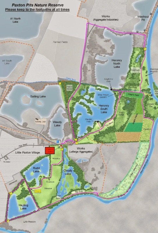 By car, Paxton Pits reserve is 5 minutes drive from A1 trunk road. Click on the P in the map for directions to the car park. Nearest train station, St Neots, 2 miles. Bus 66 from St Neots or Huntingdon, alight at Little Paxton