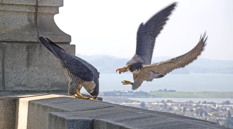 The University of California, Berkeley Campanile clock tower (Sather Tower) is well known for hosting nesting Peregrine Falcons, which are really the main reason to visit this birding place. The falcons were first observed nesting on a high ledge of the tower in 2016, with one of two fledglings surviving (the other, unfortunately, struck a window and died). In 2018 a permanent nest box was installed to replace the temporary box installed in 2017. In January of 2019, following a successful crowd-sourcing campaign, 2 webcams were installed at the nest.