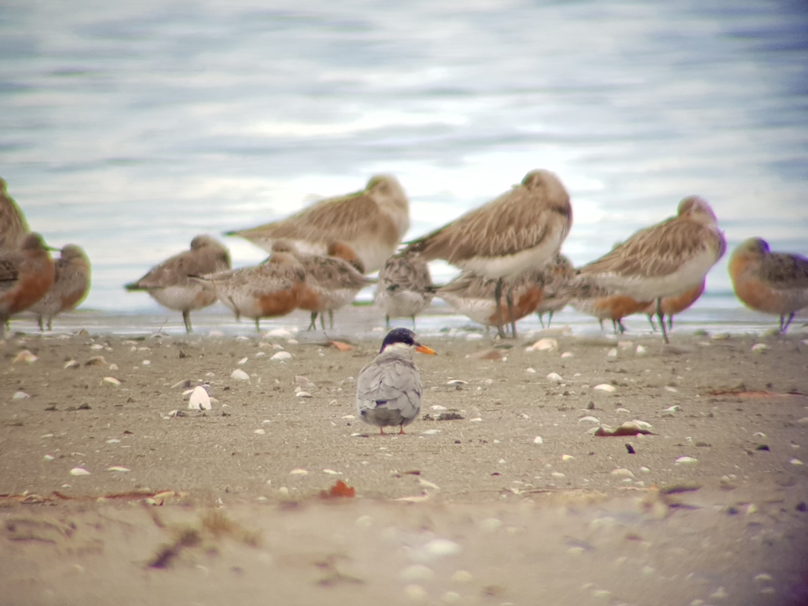 With thousands of waders roosting on the sandspit (particularly in summer), and many hundreds of gulls and terns around, the Motueka sandspit is one of the top places to see waders in Aotearoa. From a nearby car park and the first estuary, you walk out on the thin sandspit on the sand for about 3 km until you reach the regular roosting spot of hundreds of Bar-tailed Godwit, Red Knot, large numbers of Ruddy Turnstone for NZ, Wrybill, Pied Stilt, and the two oystercatcher species. The uncommon Whimbrel are regulars in summer, and the site is frequently visited by rarities such as Terek Sandpiper and Australian Tern. On the spit and in the estuary besides it you can expect White-fronted Tern and Caspian Tern throughout the year and Black-fronted Tern from February to October.