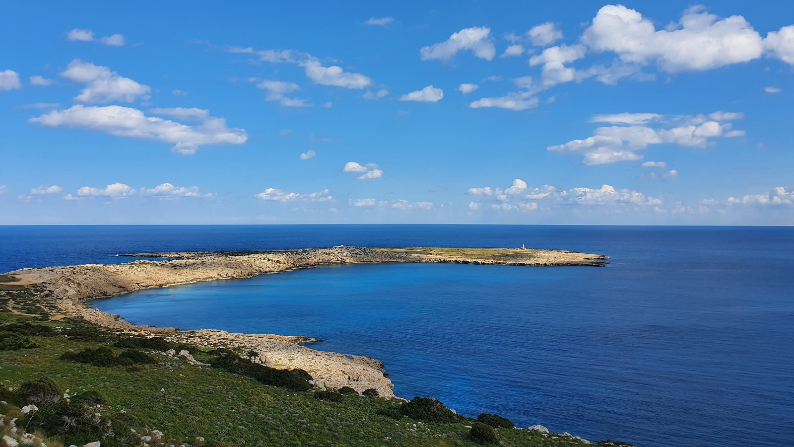 Cape Greco is at the southern end of Famagusta Bay. It lies between the towns of Ayia Napa and Protaras. There are several parking areas. Click on the P in the map to get directions. It is a beautiful natural area with caves, natural arch bridges, cliffs, beaches, hiking trails and a crystal clear sea. At the end of the cape there is a lighthouse but it is usually inaccessible because the road is closed.