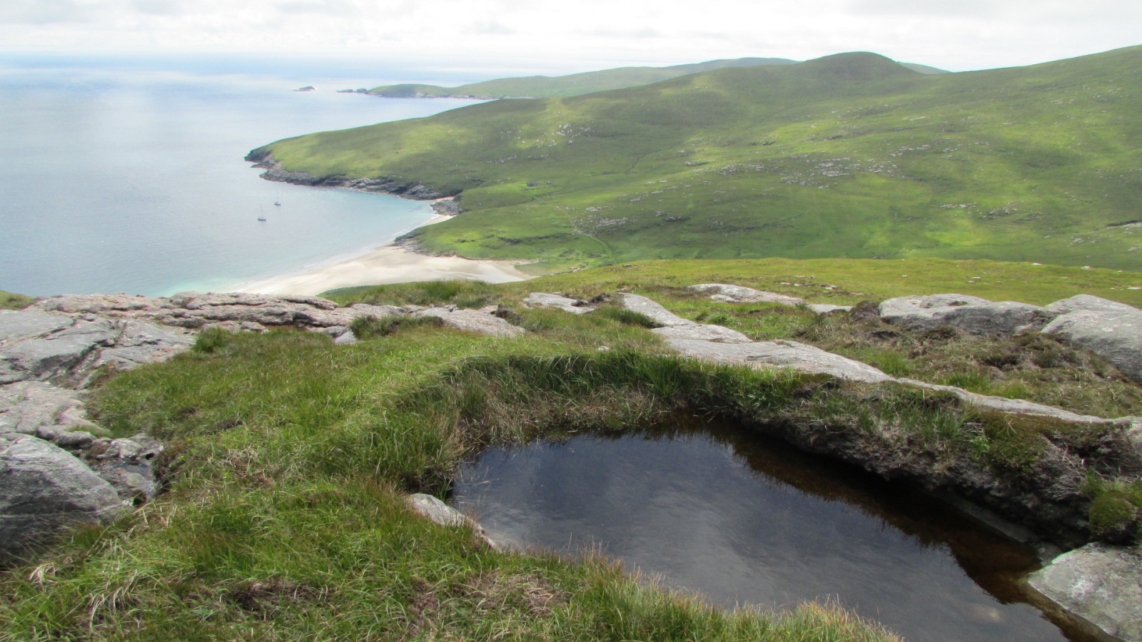 Mingulay is located at the Southern tip of the Outer Hebrides (close to Barra Head, in the Bishop's Isles) and is a mix of high cliffs (the highest point of the island is over 270 m) and gentler slopes covered in heathland and protruding rocks. Wide beaches can be found on the Eastern side, where introduced rabbits graze and dig burrows among the ruins of an old village now deserted. Small reed beds around streams will surprise you in their diversity.