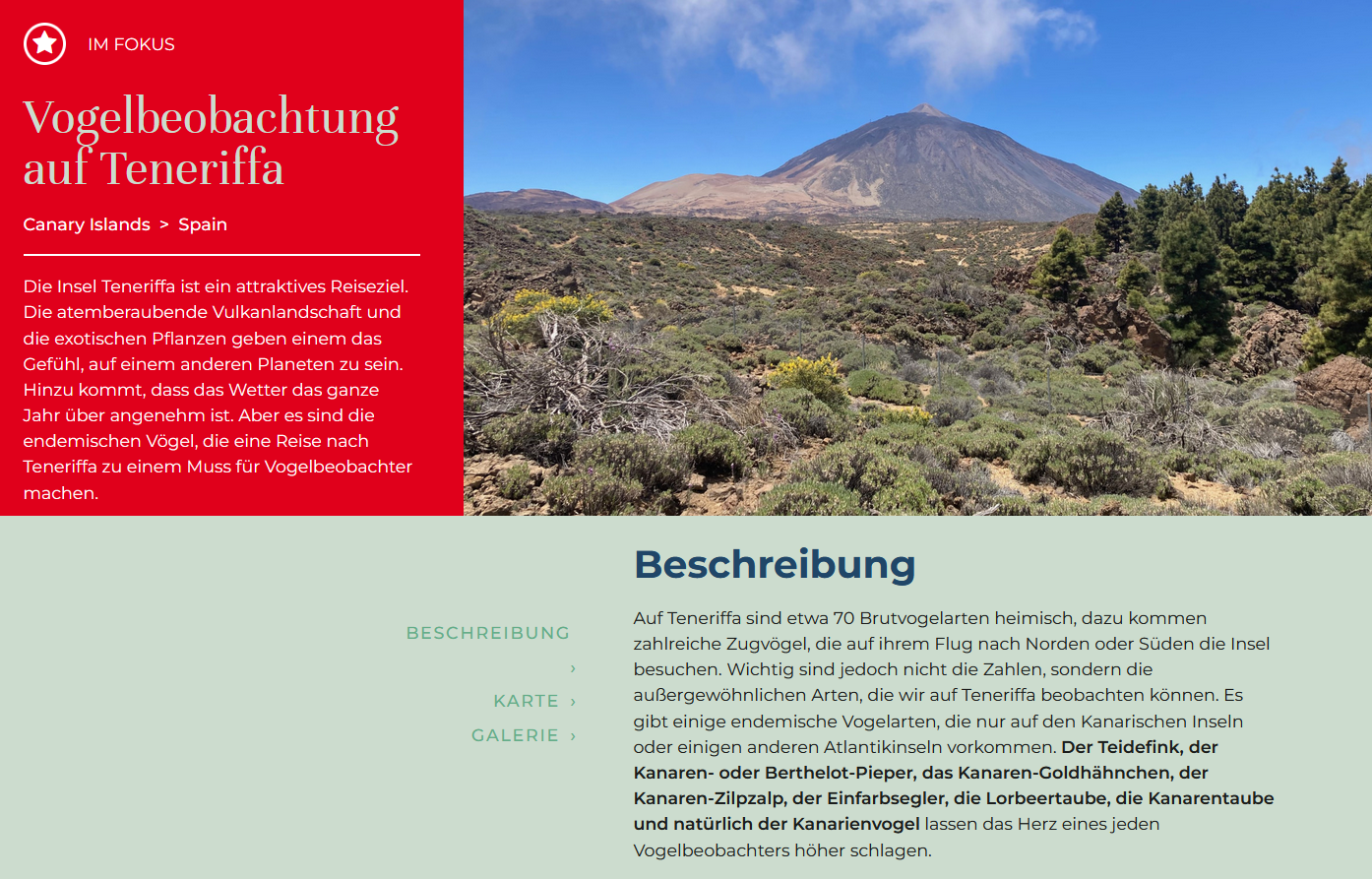 Die erste Im Fokus-Seite, die wir veröffentlichen, ist Teneriffa. Der ideale Ort, um auf den Kanarischen Inseln endemische Vögel wie Teidefink, Kanaren- oder Berthelot-Pieper, Kanaren-Goldhähnchen, Kanaren-Zilpzalp, Einfarbsegler, Lorbeertaube, Kanarentaube und natürlich der Kanarienvogel. Schauen Sie sich die Im Fokus-Seite von Teneriffa unter www.birdingplaces.eu/tenerife an