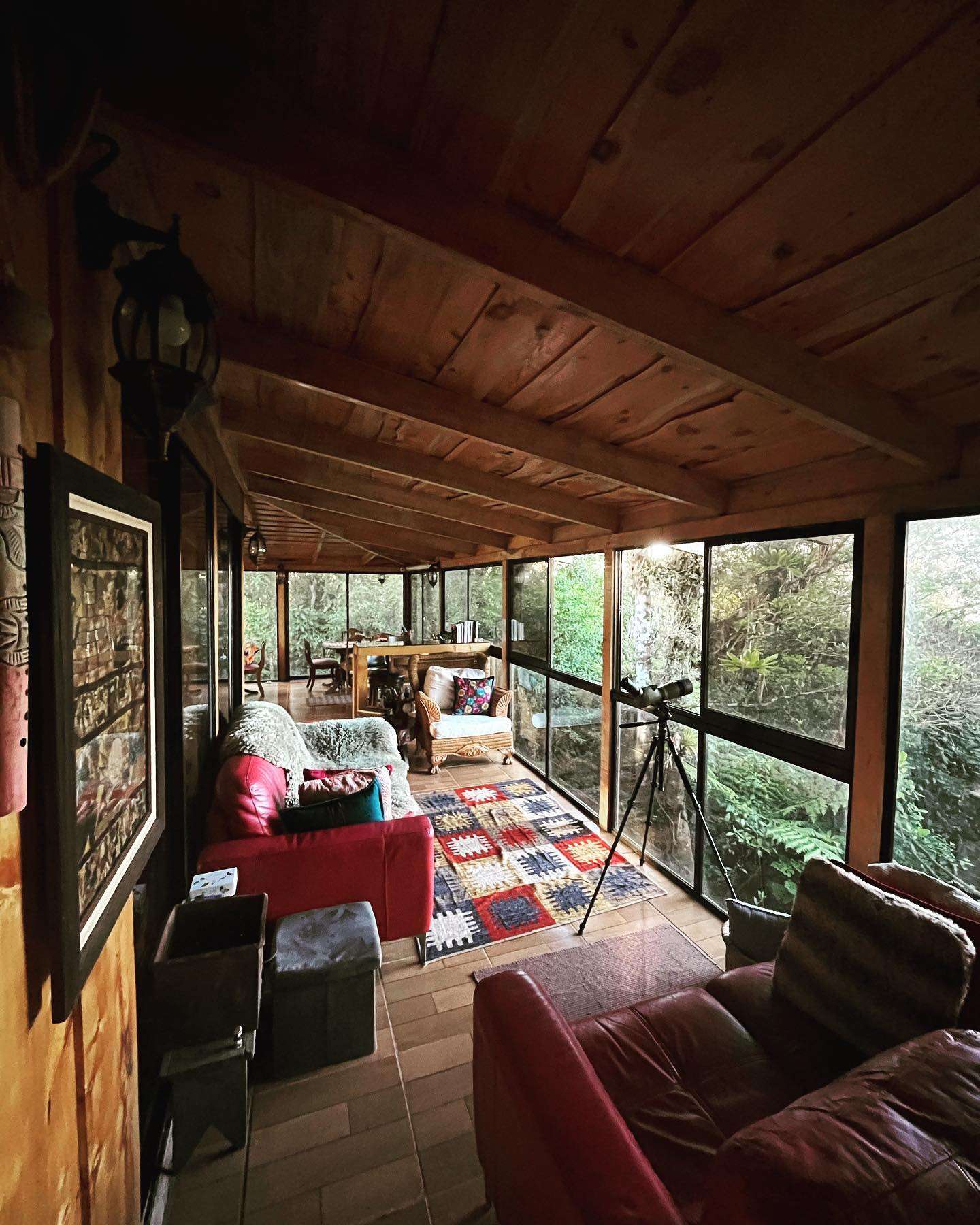 From the comfy observation sofa, I observed a feeding station attracting Slaty Flowerpiercer, Spangle-cheeked Tanager and Silver-throated Tanager, Purple-throated Mountain-gem, Prong-billed Barbet, Common Chlorospingus, Chestnut-capped Brushfinch, White-naped Brushfinch and Yellow-thighed Brushfinch. Both Mountain Thrush and Clay-colored Thrush also showed up. On the ground, spilled wheat attracted a Ruddy-capped Nightingale-Thrush, and one of the specialty birds, the elusive Buff-fronted Quail-Dove. Even the extremely elusive Buffy-crowned Wood-Partridge often makes an appearance, too, but I wasn’t so lucky.