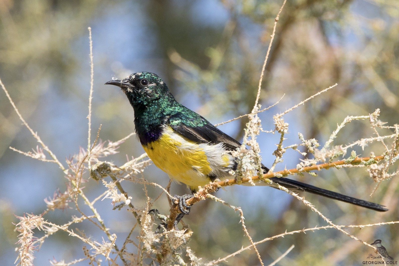 Nile Valley Sunbird in breeding plumage can be seen near the parking area from December to February.
