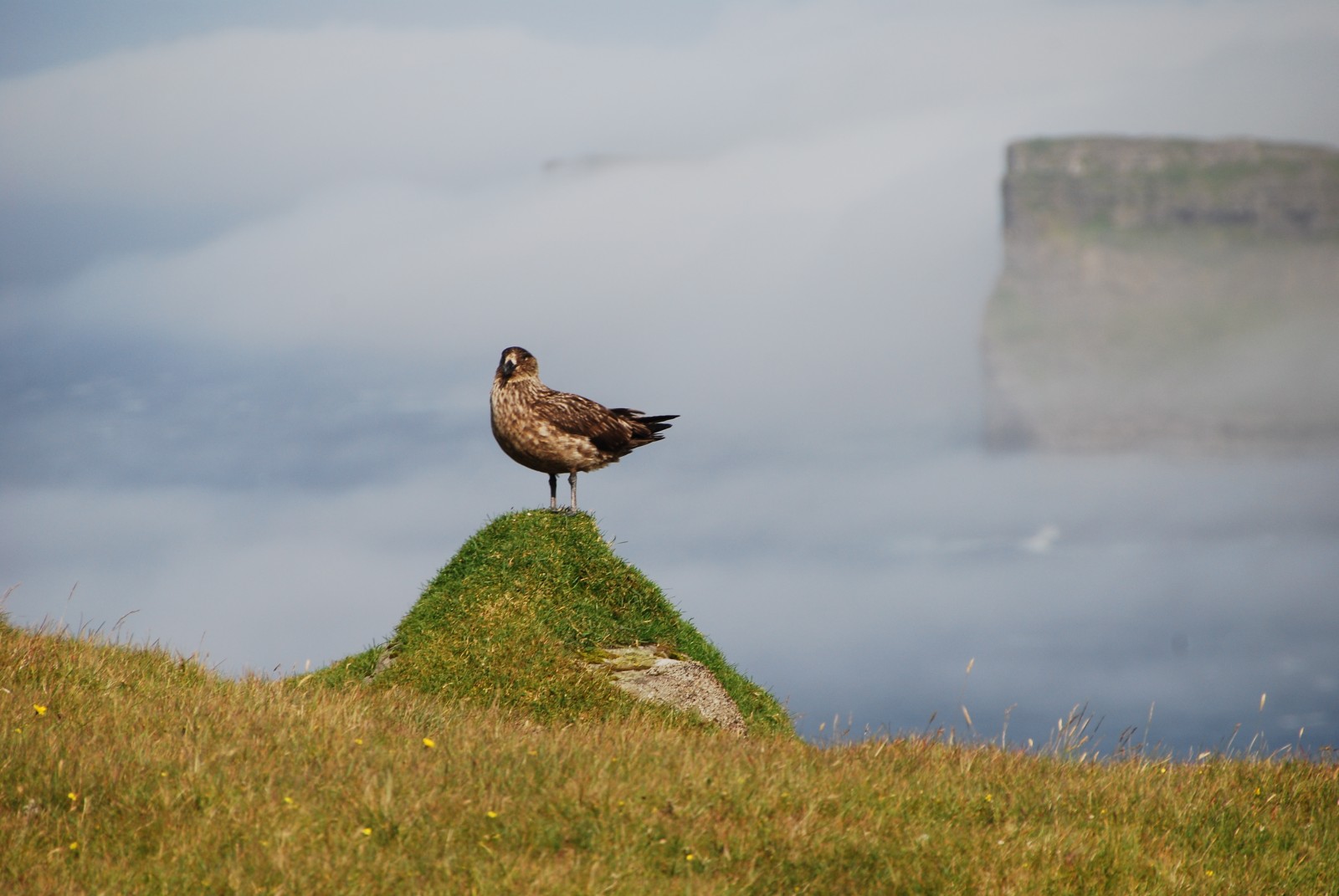 There is a small community on the island. Skuvoy which is named after the large number of Great Skua breeding there, is an island with a rugged coast, steep cliffs, boulder-screes and grass slopes. The cliffs are breeding sites of Northern Fulmar , Manx Shearwater , European Storm Petrel , Common Guillemot , Black Guillemot , Atlantic Puffin and Kittiwake . Whimbrel are breeding on the grassland.