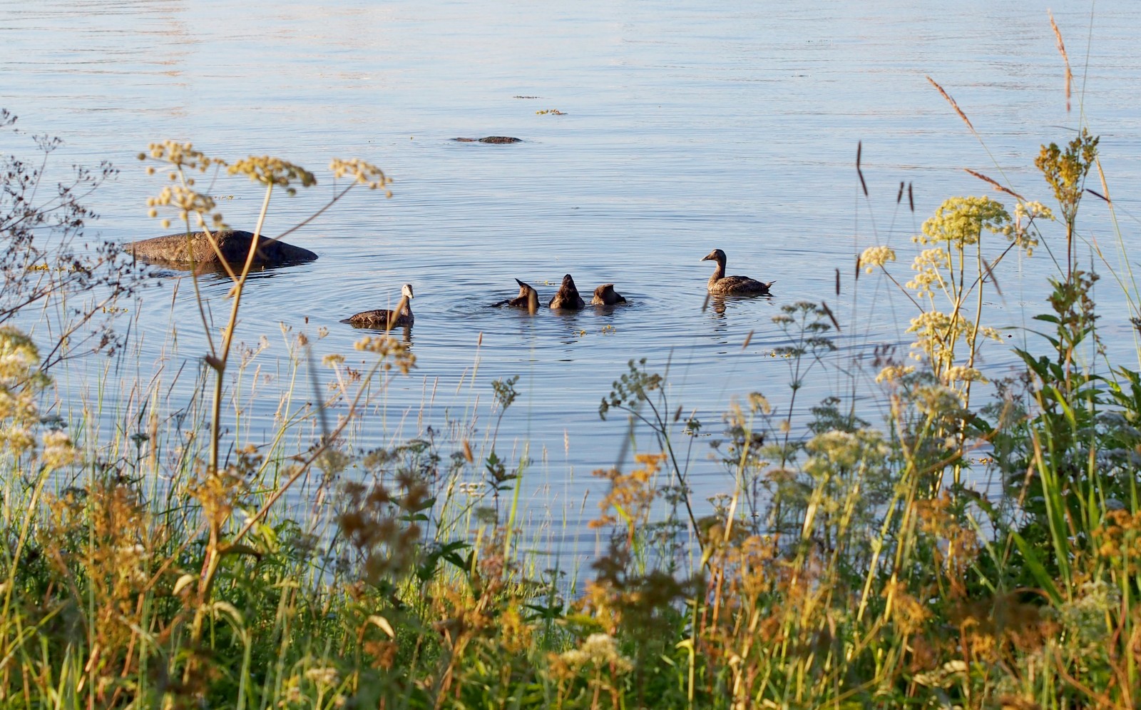 Särkkäniemi Nature Reserve is a great spot for seeing waterfowl all around the year. Mute Swan family can be seen around the area on a daily basis and Goosander and Mallard are common sightings as well. Common Goldeneye , Red-breasted Merganser , Tufted Duck , Great Crested Grebe , Barnacle Goose , Whooper Swan , Northern Shoveler and Common Eider are common birds especially during the warmer months. Grey Heron likes to stop by the rocky points of the shore and Great Cormorant often dries its wings by the point too.