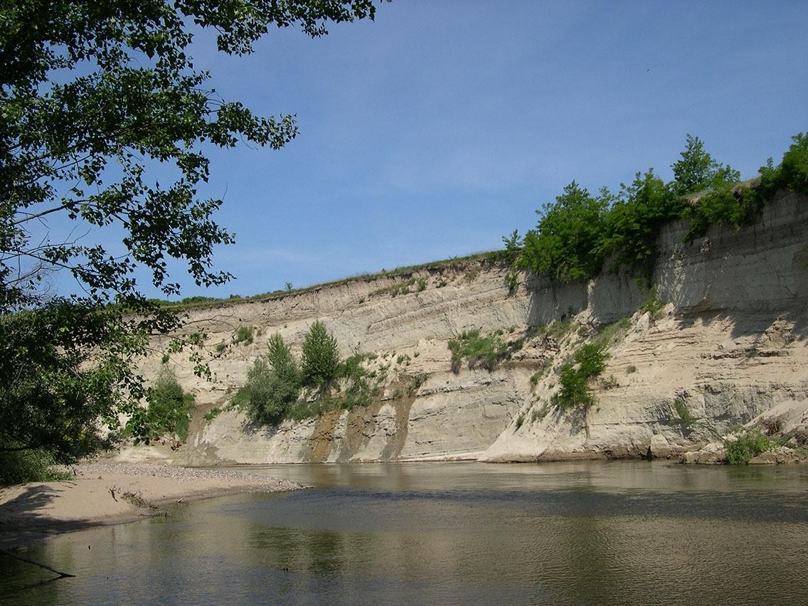 Français: Falaise avec zone de randonnée au dessus (idéale pour voir les guêpiers qui se posent en hauteur) et zone de plage en dessous. Ses 15 m de haut en font un habitat protégé pour des oiseaux qui nichent à cet endroit. Ce sont quelques 200 nids d'hirondelles de rivage installés sur la paroi, des martins pêcheurs, plusieurs dizaines de guêpiers d'Europe viennent en mai pour passer l'été et repartir vers l'Afrique pour l'hiver et beaucoup d'autres espèces sont visibles aux alentours (cormorans, hérons, aigrettes)