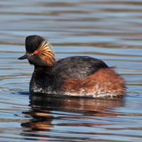 The northern part is designed as a biotope. Water during the whole year, but shallow and quickly freezing during winter. Shallow with small mud surfaces and extended reed areas. Good place for breeding, resting and (when there's no ice) hibernating waterfowl, migrating shorebirds and marsh terns, like Black Tern, in smaller numbers. But often interesting diversity, almost all european heron species documented as visitors, breeding Acrocephalus warblers, Bluethroat, Whinchat and European Stonechat.