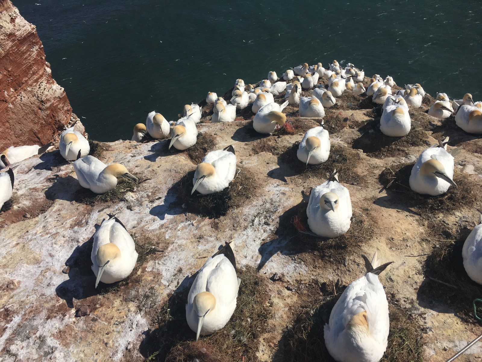 Helgoland is the place in Germany with the most recorded bird species: 430 species recorded. The basis are the 'Big Five' Seabird Species at the breeding colony at the steep red cliff: Northern Gannet (~2000 breeding pairs), Common Guillemot (~4000 breeding pairs), Razorbill (~80breeding pairs), Kittiwake (~4000 breeding pairs) and Northern Fulmar (~50 breeding pairs). The Northern Gannet breed directly behind the visitor fence and can be observed absolutely closely! Best time to see the breeding birds is May to June. In the evenings of June the young flightless Common Guillemot and Razorbill jump from the cliff into the sea, the so called "Lummensprung".