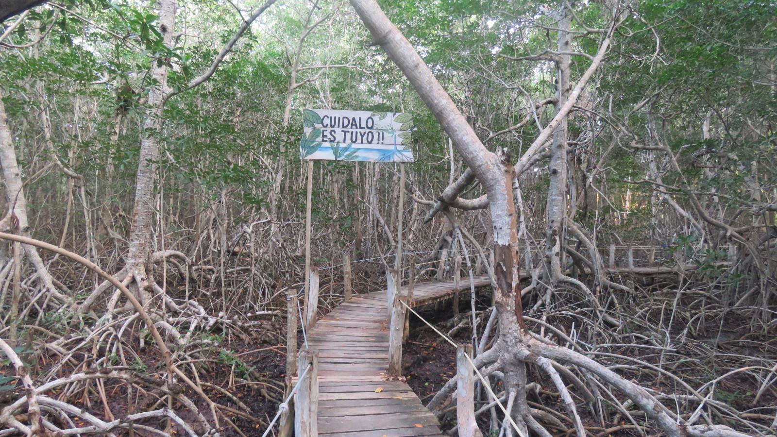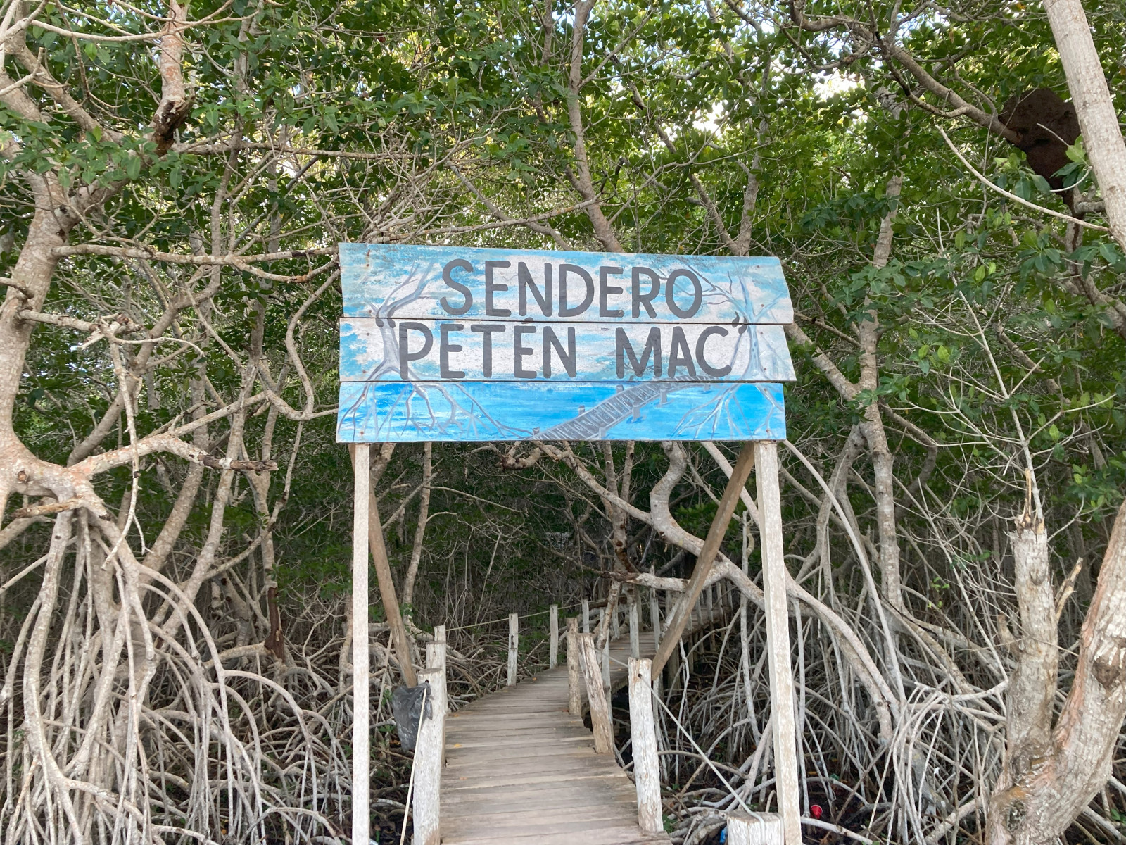 Sendero Petén Mac is a short trail and wooden walkway through mature mangrove forest leading to a pond with crocodiles. The forest is wonderfully cool and the walk between and above the roots of the mangrove trees is short but beautiful. The sendero ends at a small pool with a few crocodiles and dozens of baby crocodiles. The wooden boardwalk elevates you far enough above the water so you don't have to be afraid of the crocodiles and there are also some benches where you can sit quietly to enjoy all the sounds. Plenty of birds in the early morning, but it is not always easy to see them in the dense vegetation. Nevertheless, a beautiful place and highly recommended if you are in the area.