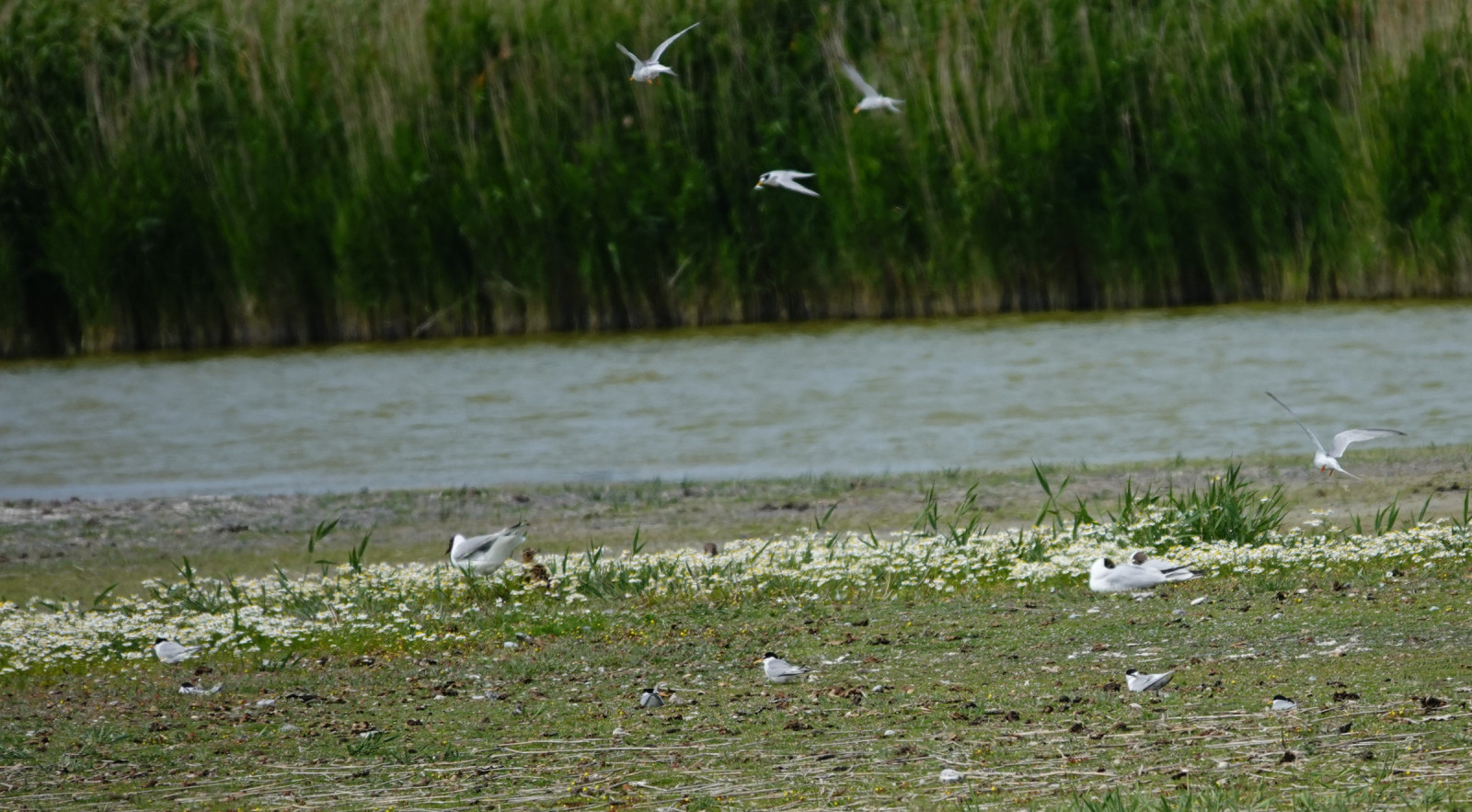 Je kunt het gebied ook mooi in zijn geheel overzien vanaf de zeedijk ter hoogte van de vuurtoren en Vogeltelpost Westkapelle (3). Hier steken tijdens het broedseizoen vaak dwergsterns de dijk over om te gaan foerageren in de branding. Ze vliegen dan soms vlak langs je heen en je kunt ze mooi zien vissen aan zee en weer terugkeren naar hun nesten.