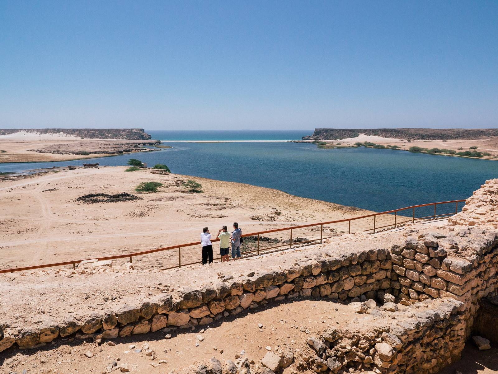 The lagoon of Khor Rori is located just east of Taqah. Click on the P in the map for directions or coordinates. From the museum car park, take the track towards the mouth of the river. Depending on the capacity of your vehicle you can do this by car or on foot. You will reach a beautiful beach between the sandstone jaws that partially block the entrance to the lagoon.