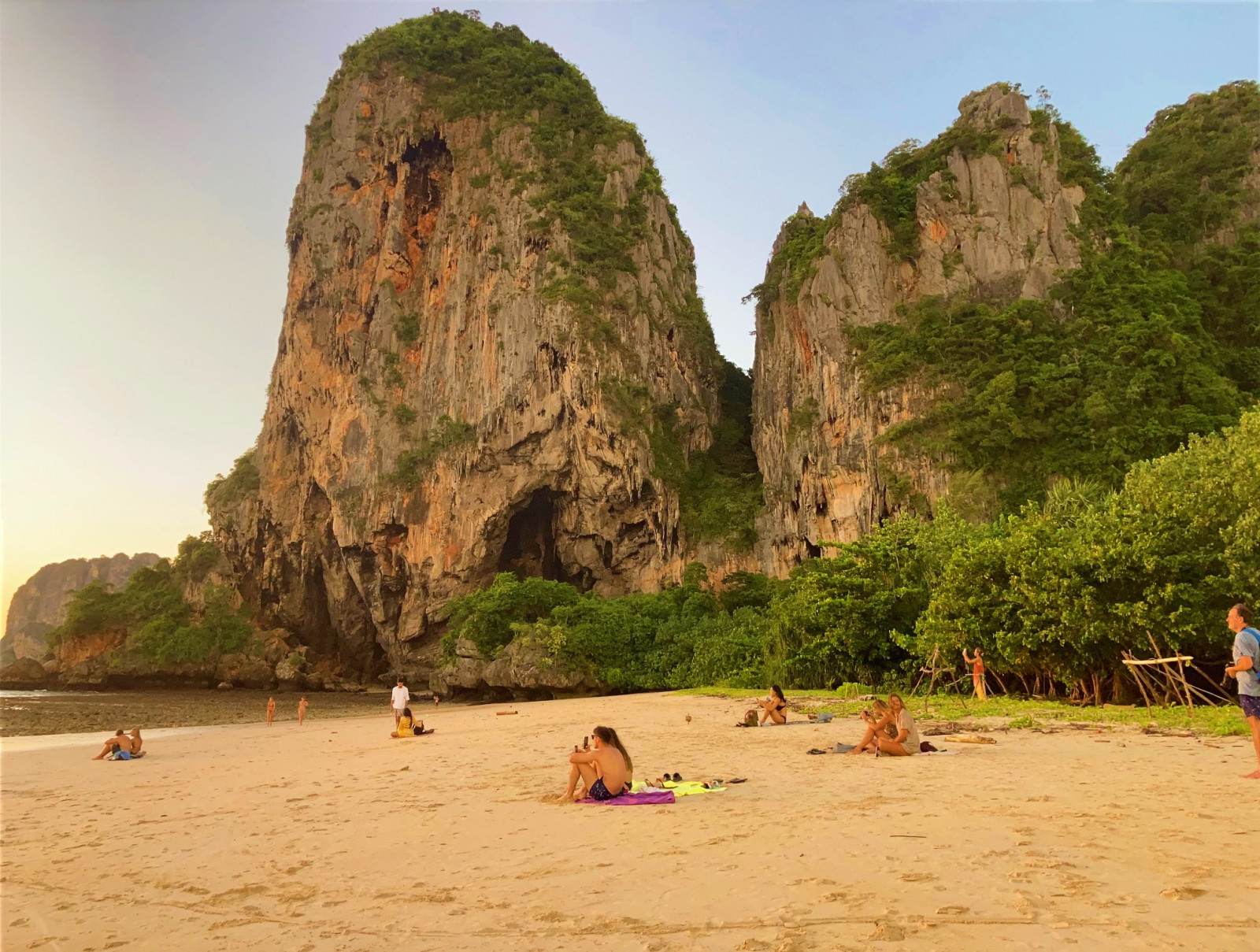 Railay is a small peninsula between the cities of Krabi and Ao Nang. Only accessible by boat due to high limestone cliffs cutting off mainland access. Railay has a kind of island feel. The cliffs, beaches and bays are of extraordinary beauty. On the west of the peninsula are 3 beaches. On the east coast are patches of mangrove and mudflats during low tide. The hinterland in the north is a jungle area where 3 species of monkey roam (including gibbon) and many birds can be found.