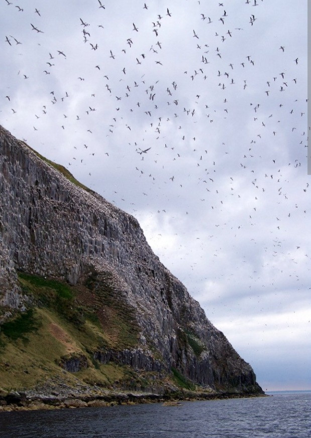 Ailsa Craig is located in the outer Firth of Clyde, 16 km west of mainland Scotland. The island is 340 m high, about 2.5 miles (4 kms) around the base and is made of very hard granite. It has a very large Northern Gannet colony, plus colonies of Lesser Black-backed Gull, Great Black-backed Gull, Common Guillemot, Razorbill, European Shag, Kittiwake, Black Guillemot and a few Atlantic Puffin. Offshore European Storm Petrel, Manx Shearwater and Sooty Shearwater. Also Yellowhammer and other small birds. Otters and seals.