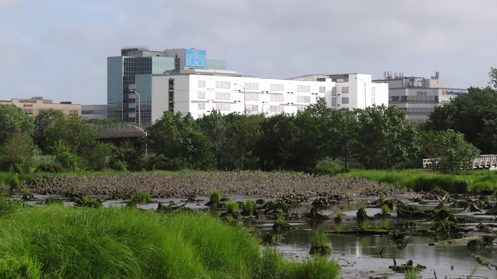 Mill Creek Marsh was saved from residential development in 1996, when approximately 100 hectares of marshland was acquired by the New Jersey Meadowlands Commission. Two impoundments, both communicating with the Hackensack River and thus both tidal, are encircled by a broad, level, well-maintained 1.5 km path that gives views of the impoundments, open channels, and surrounding saltmarsh. At low tide, the massive stumps of Atlantic white cedars, felled a century ago for lumber, are visible in the southern impoundment. The present vegetation is a mixture of native spartina cordgrasses, non-native phragmites reeds, and short trees, most of them introduced. Small patches of denser woods, at the southeastern corner of the area and along the two short spur trails on the west side, are particularly attractive to migrant songbirds.