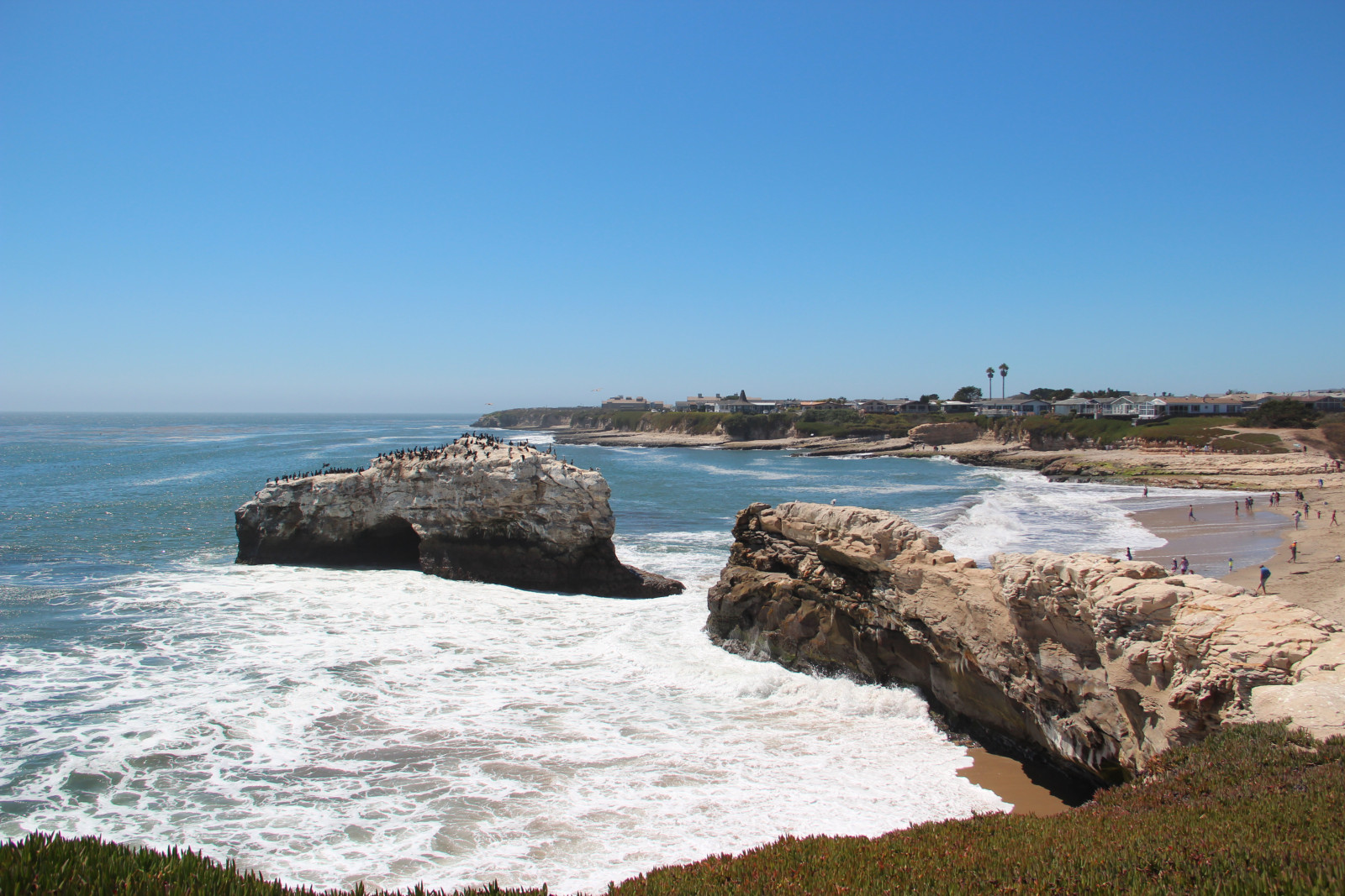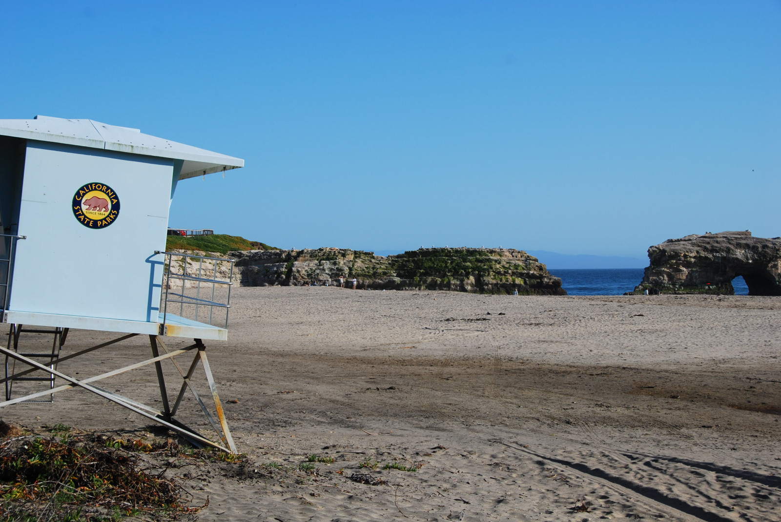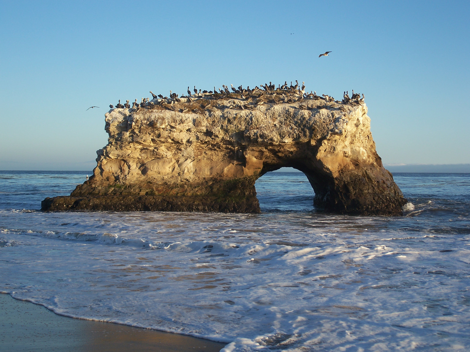 Natural Bridges is named for a rocky arch (the last of 3 original rock arches) formed from an eroded peninsula of cliff that once protruded from the coastline. It includes a sandy beach, reached from a short trail from the parking lot, and is bracketed by the Moore Creek Wetlands Natural Preserve to the North - with marshy creek estuary habitat, and the Monarch Butterfly Natural Preserve in a stand of Eucalyptus to the south of the parking lot. Rocky shoreline lies on either side of the beach and includes tide pools at low tide.