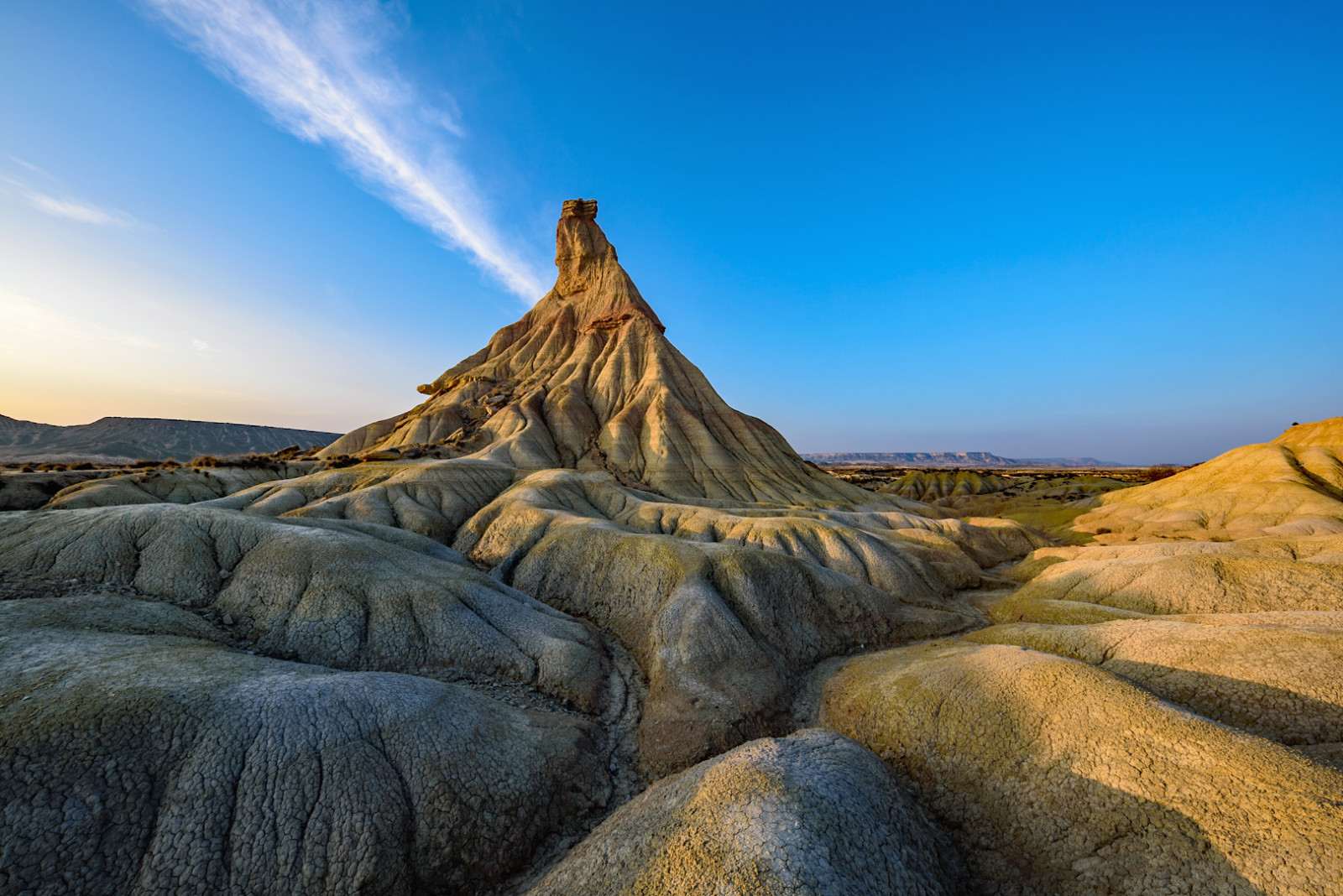 Espagnol: Reserva de la Biosfera de Bardenas Reales de Navarra. Caracterísicas paisajísticas y ecológicas únicas en Europa. Aves ligadas a estepas subdesérticas, saldares, acantilados, cultivos, pinares y zonas húmedas Desde el punto de vista morfológico existen tres zonas diferenciadas: al norte se encuentra la gran meseta, conocida como El Plano. Ocupando la zona central está La Blanca, gran depresión en la que la escasez de estratos duros capaces de proteger las arcillas da lugar a formas erosivas espectaculares y caprichosas (bad lands). La Negra es la zona situada al sur y está compuesta por un conjunto de relieves tubulares horizontales.